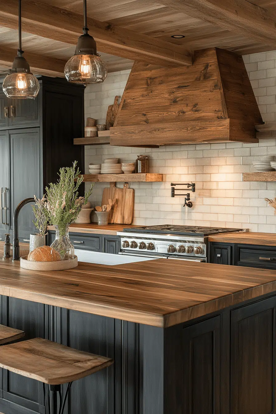 Butcher block details bring warmth and function to rustic kitchen cabinets through rich wood surfaces. The tactile quality adds charm to everyday tasks. Natural grain patterns keep the look visually interesting. This style works with both classic and modern elements. It’s practical, cozy, and timeless. Explore butcher block inspiration and see more!