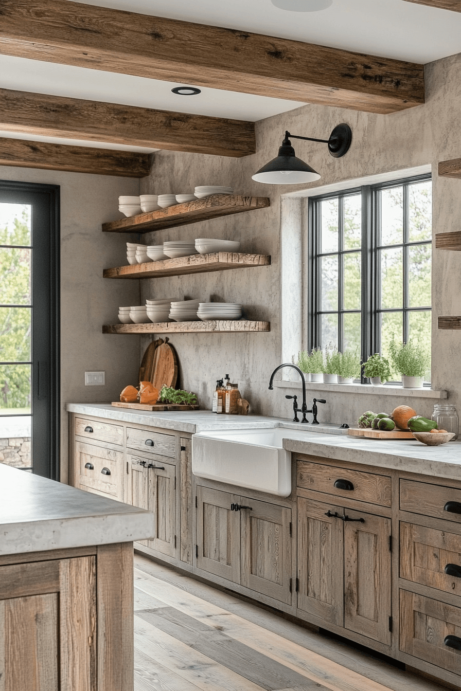 Concrete surfaces create striking contrast alongside rustic kitchen cabinets by highlighting natural wood warmth. The cool gray tones balance organic textures beautifully. This pairing feels modern yet grounded. It works especially well in contemporary rustic spaces. The materials complement each other effortlessly. Discover this bold contrast and get inspired!