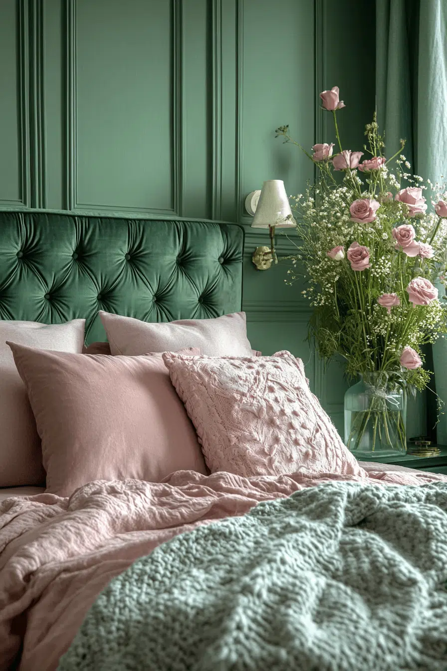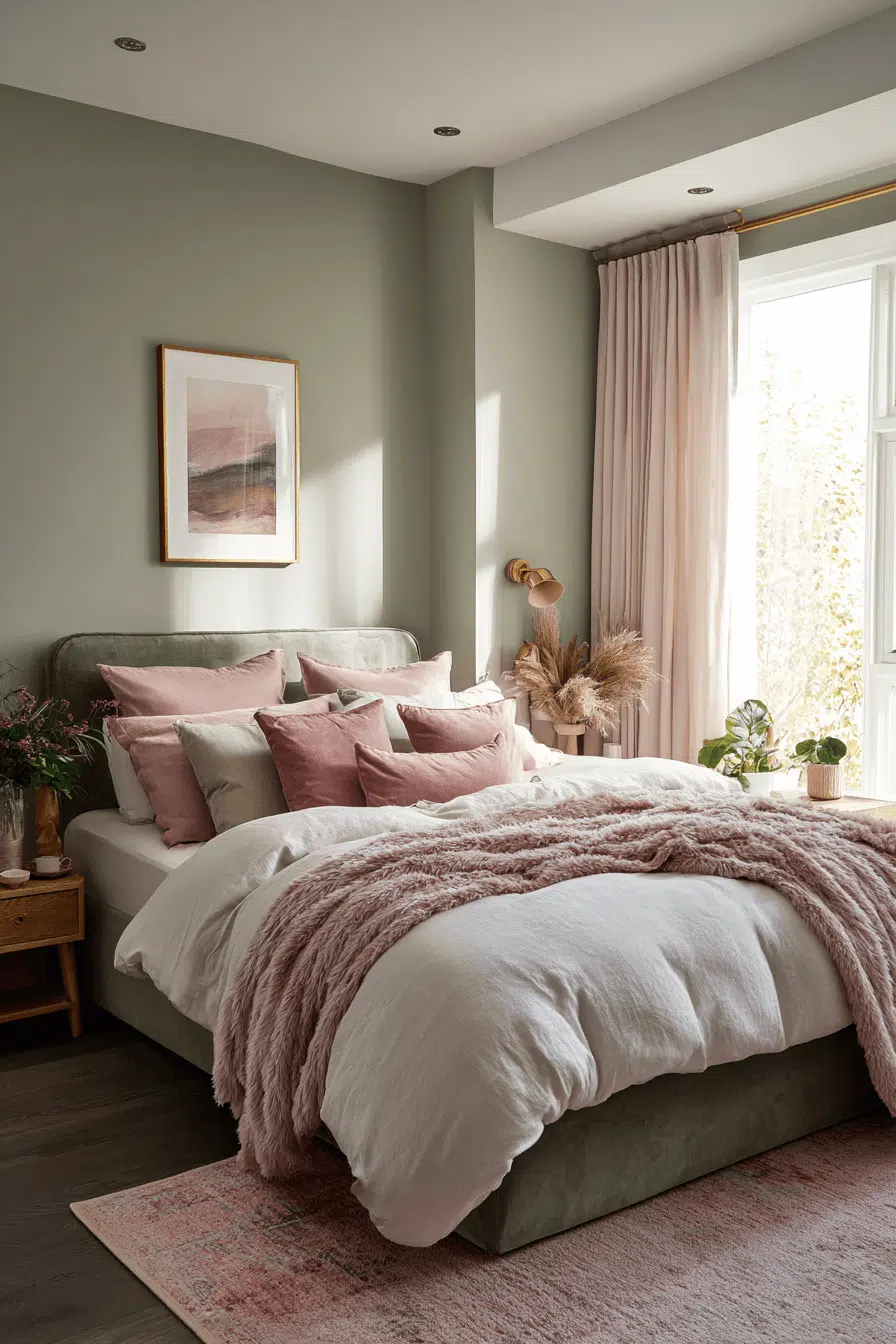 Introduce plush textures into a sage green and pink bedroom with velvet throws and brushed cotton bedding. The tactile layers enhance depth without visual clutter. Sage walls provide a soothing backdrop for rosy details. Subtle metallics add a whisper of glam. The space feels luxurious yet relaxed. Click to indulge in soft sophistication!