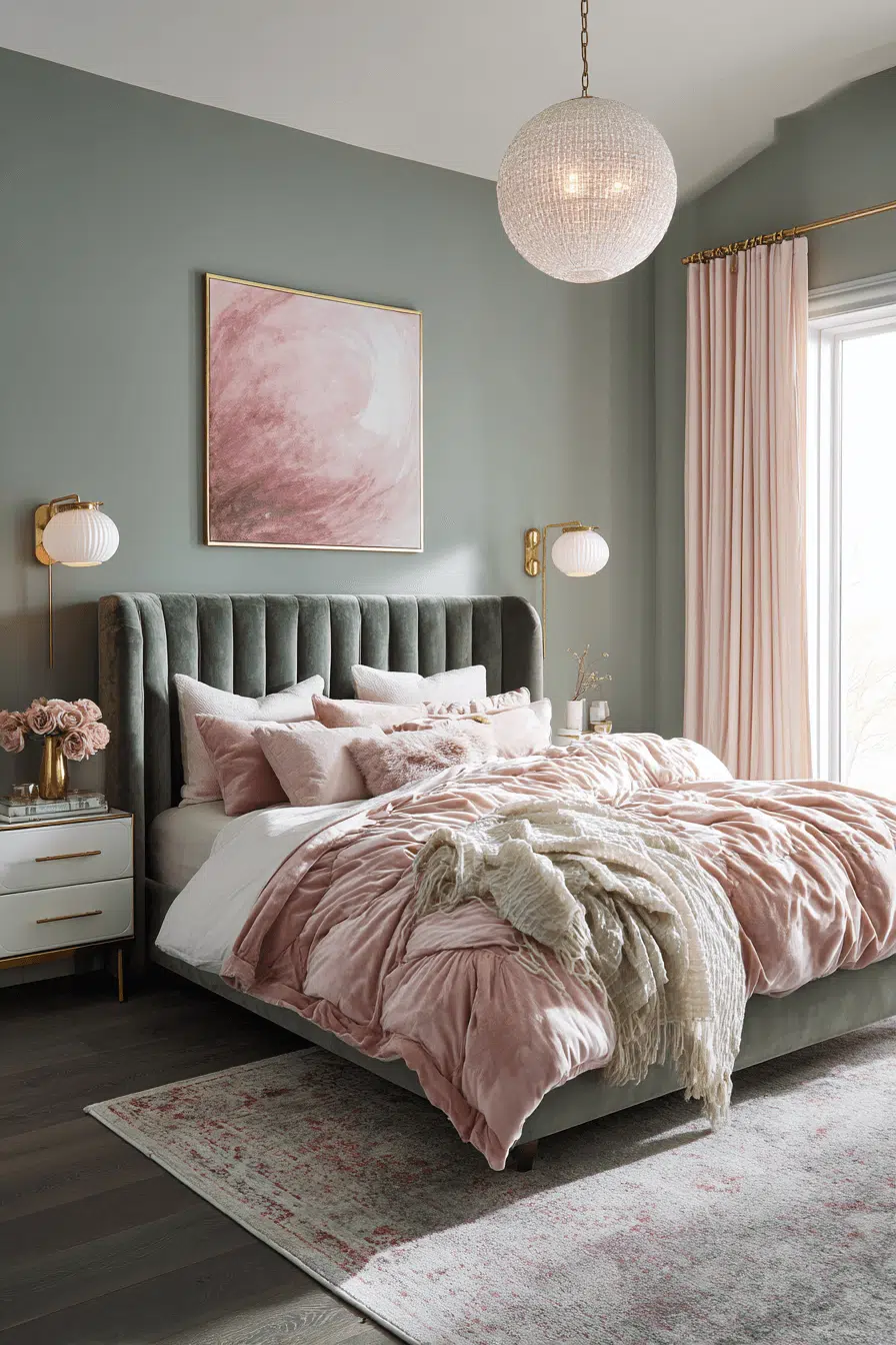 A sage green and pink bedroom becomes glamorous with brushed gold lighting and plush upholstery. The green backdrop deepens the richness of pink textiles. Geometric details add modern structure. The combination feels luxurious yet soft. It’s feminine style elevated. Tap to add soft glam charm!