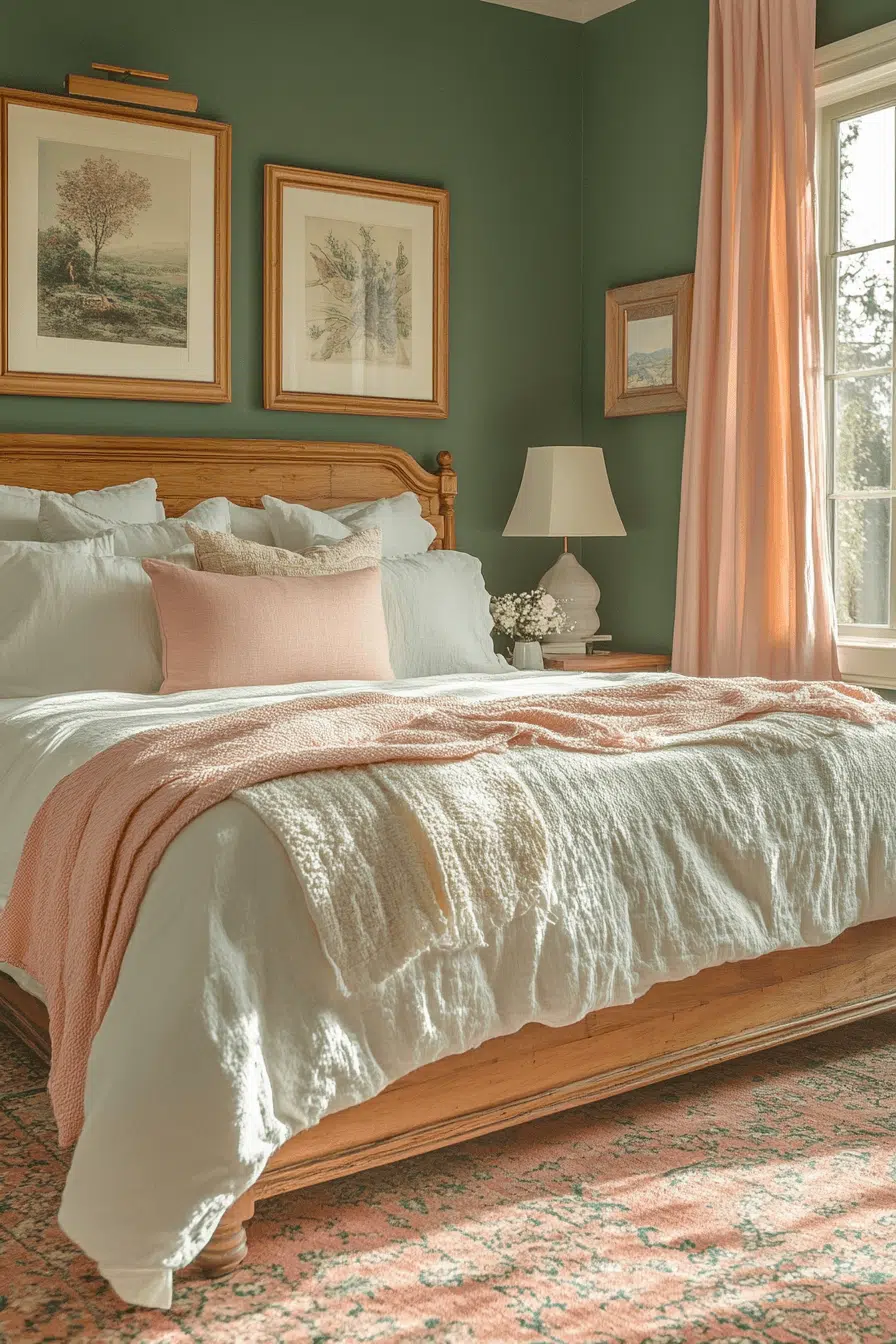 Warm peach-pink accents introduce subtle energy into a sage green and pink bedroom. The warmer undertone complements sage’s cool calm. Neutral textures tie everything together seamlessly. The space feels inviting and fresh. It’s cozy without feeling heavy. Click to warm up your bedroom palette!