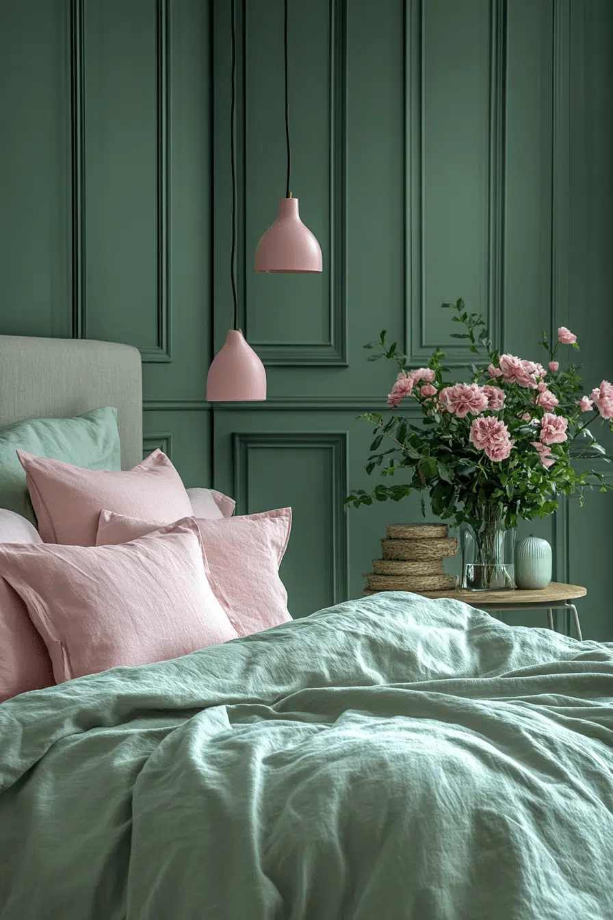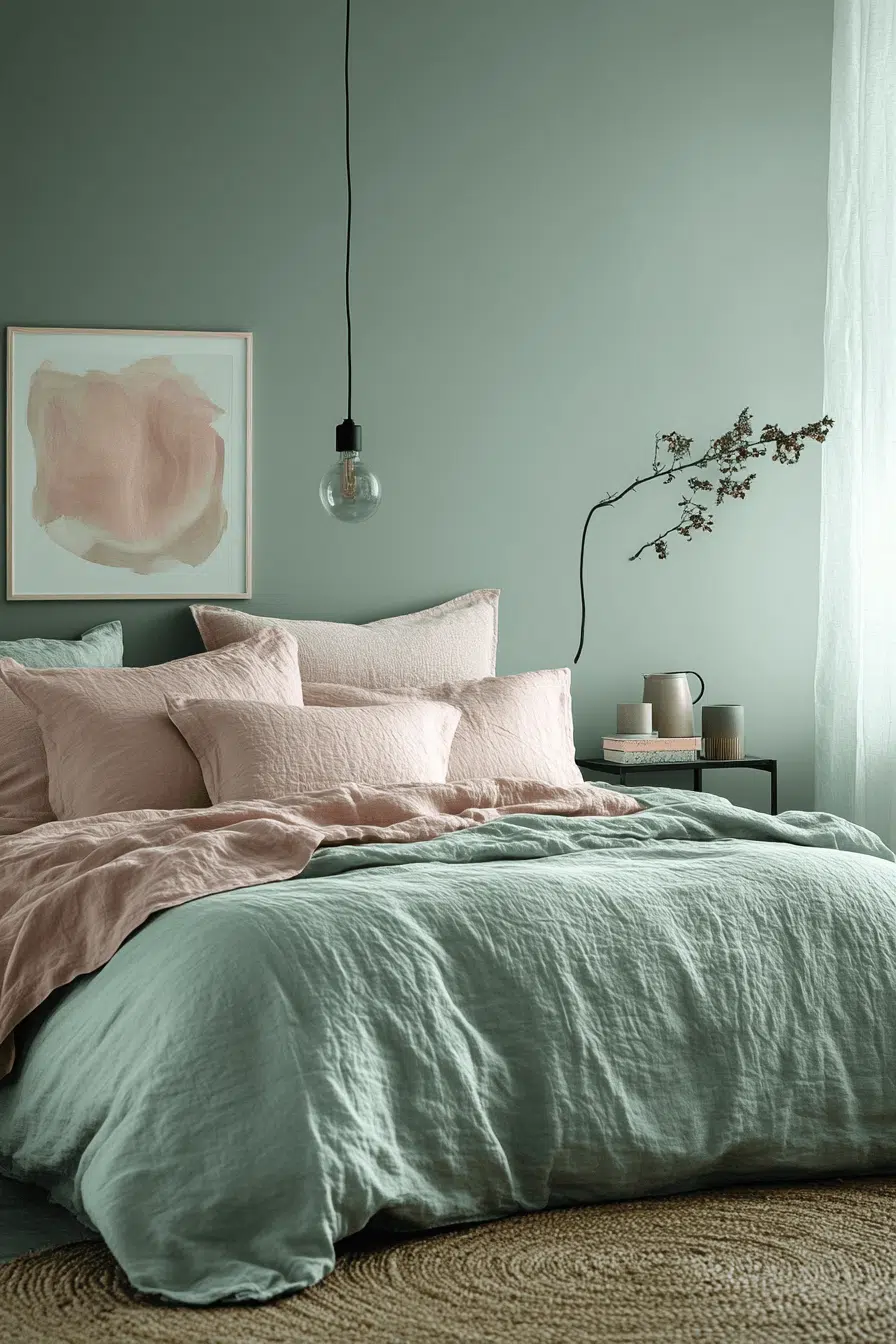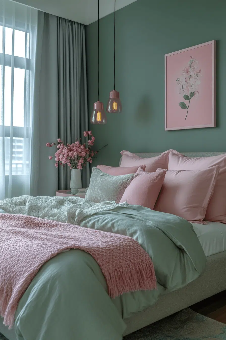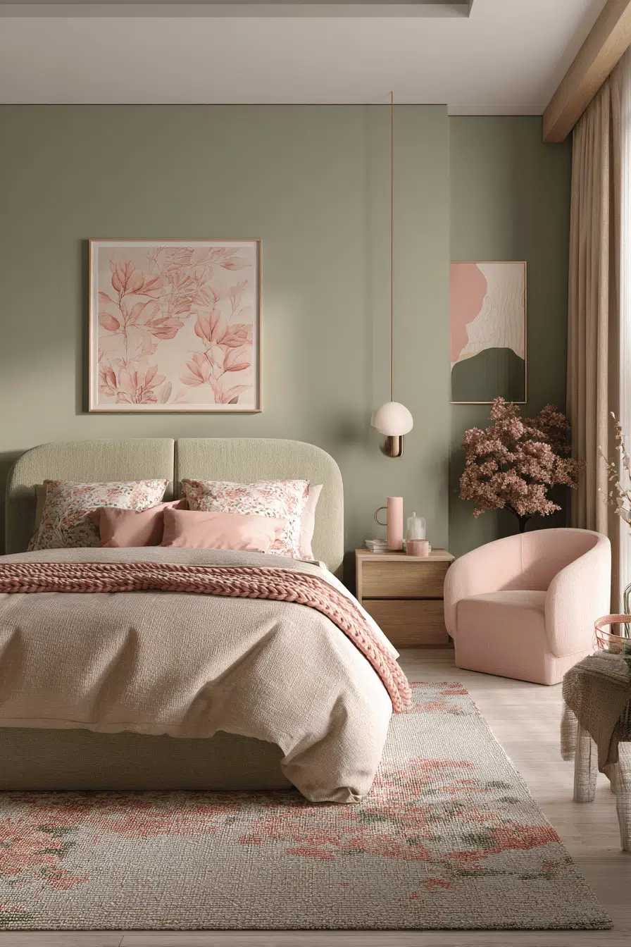 A sage green and pink bedroom layered with tonal variations feels especially cohesive. Mix soft sage with deeper moss accents and pale pink highlights. The gentle gradient creates dimension. Textural layering prevents flatness. The mood is serene yet visually rich. Click to master tonal blending!