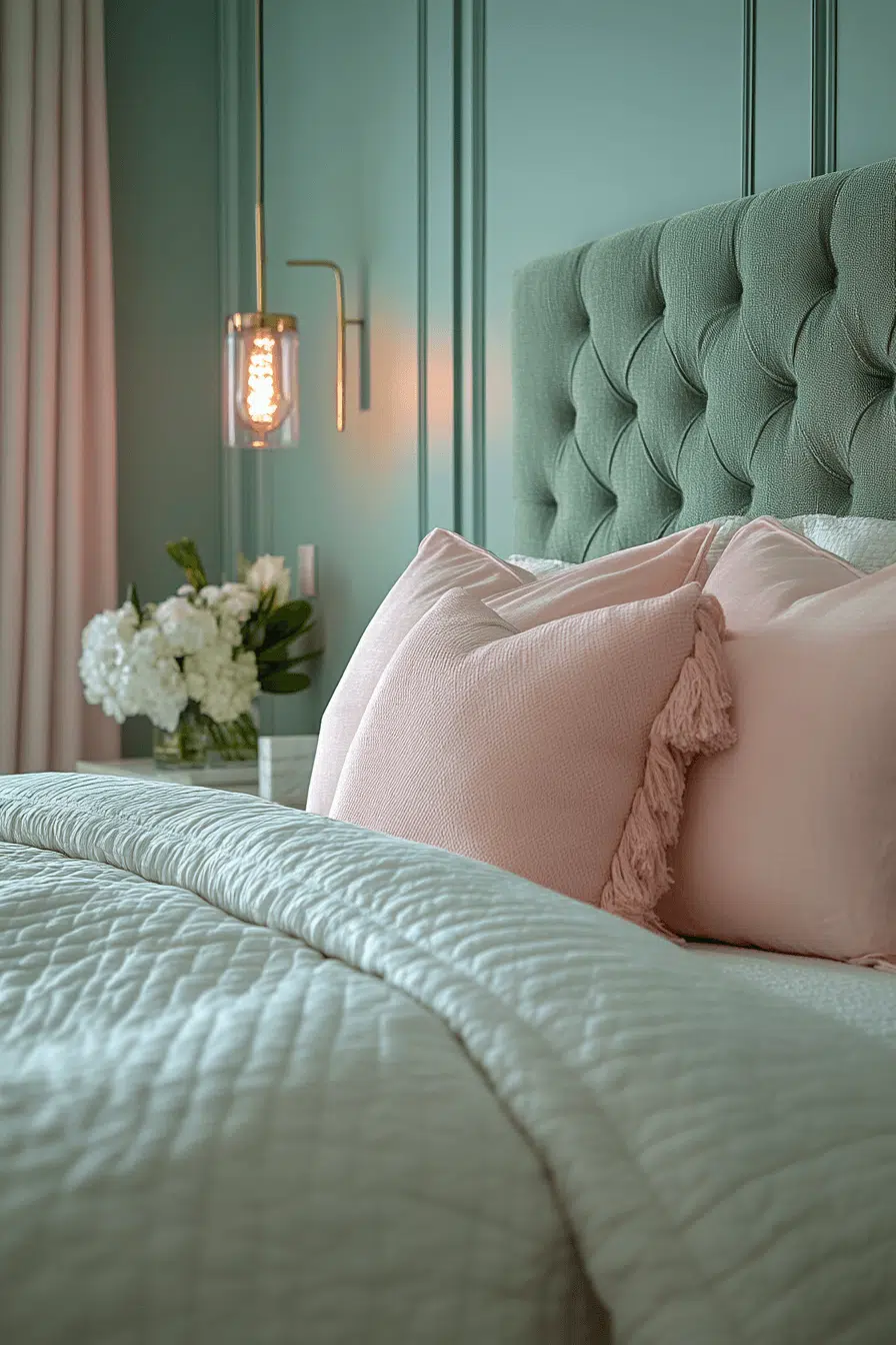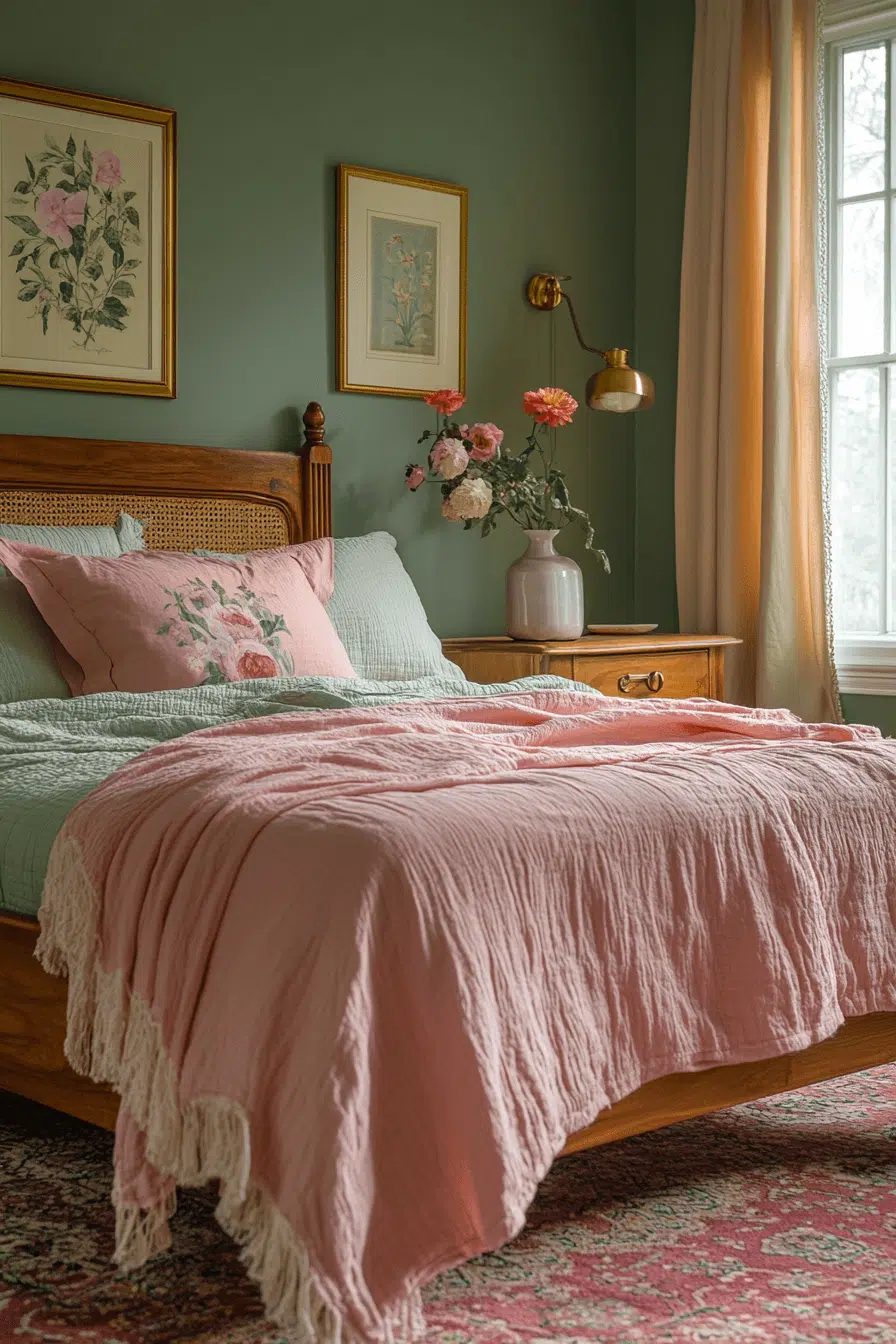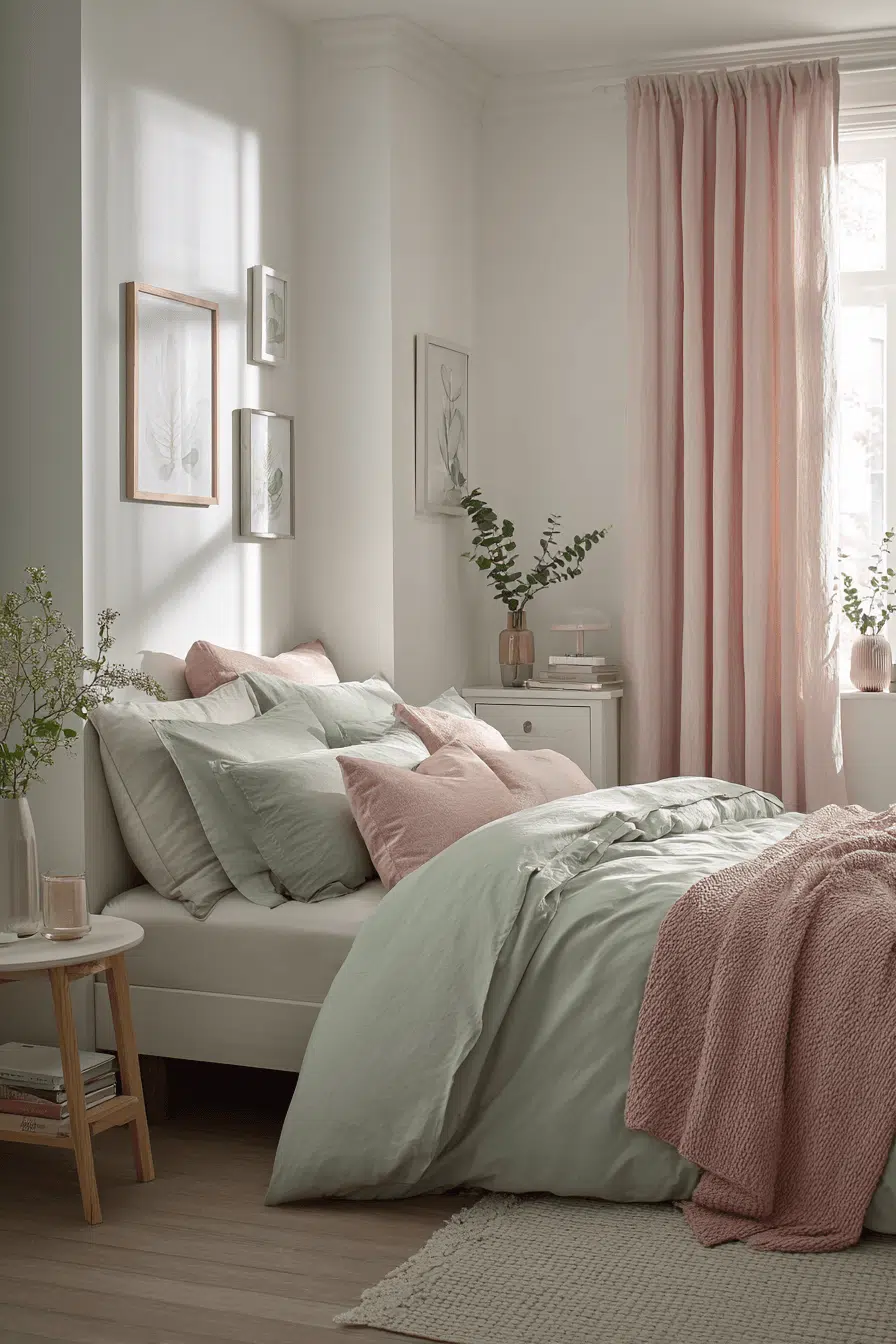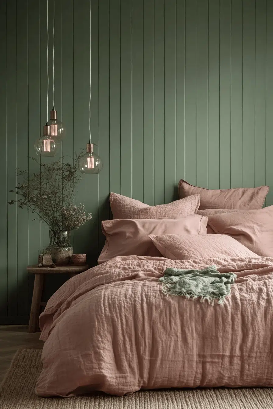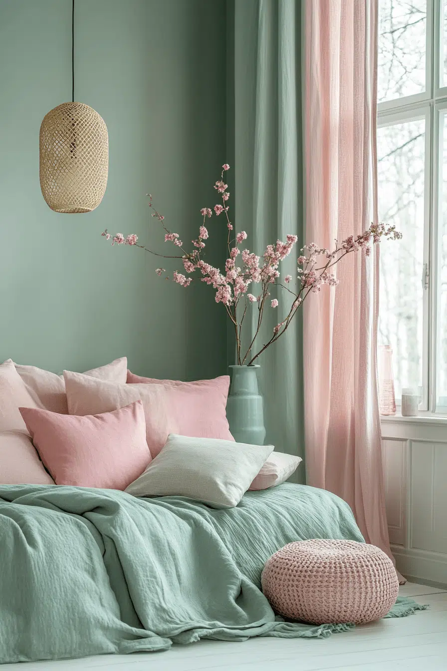 A sage green and pink bedroom layered with tonal variations feels especially cohesive. Mix soft sage with deeper moss accents and pale pink highlights. The gentle gradient creates dimension. Textural layering prevents flatness. The mood is serene yet visually rich. Click to master tonal blending!