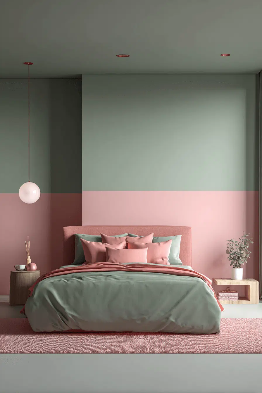 Soft matte finishes in both hues create a calming sage green and pink bedroom atmosphere. The muted surfaces absorb light gently. Layered textiles add warmth. Minimal art pieces prevent distraction. The vibe is quiet luxury at its finest. Click to explore matte elegance!