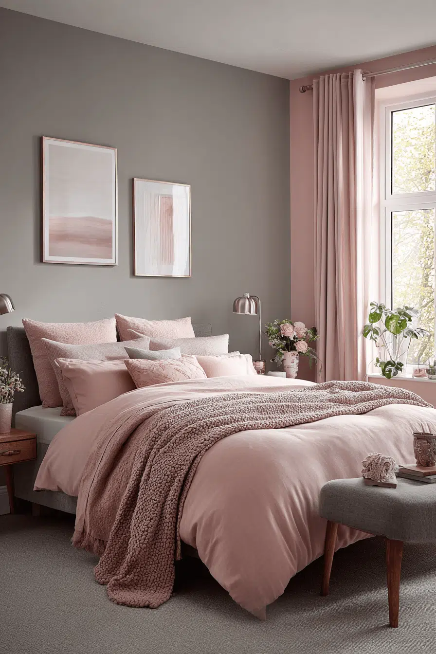 For a modern twist, style a sage green and pink bedroom with structured silhouettes and tonal layering. Pale sage walls paired with dusty pink cushions create subtle movement. Light wood furniture softens the cooler undertones. The blend feels harmonious and chic. It’s understated elegance made approachable. Click to refine your bedroom aesthetic!