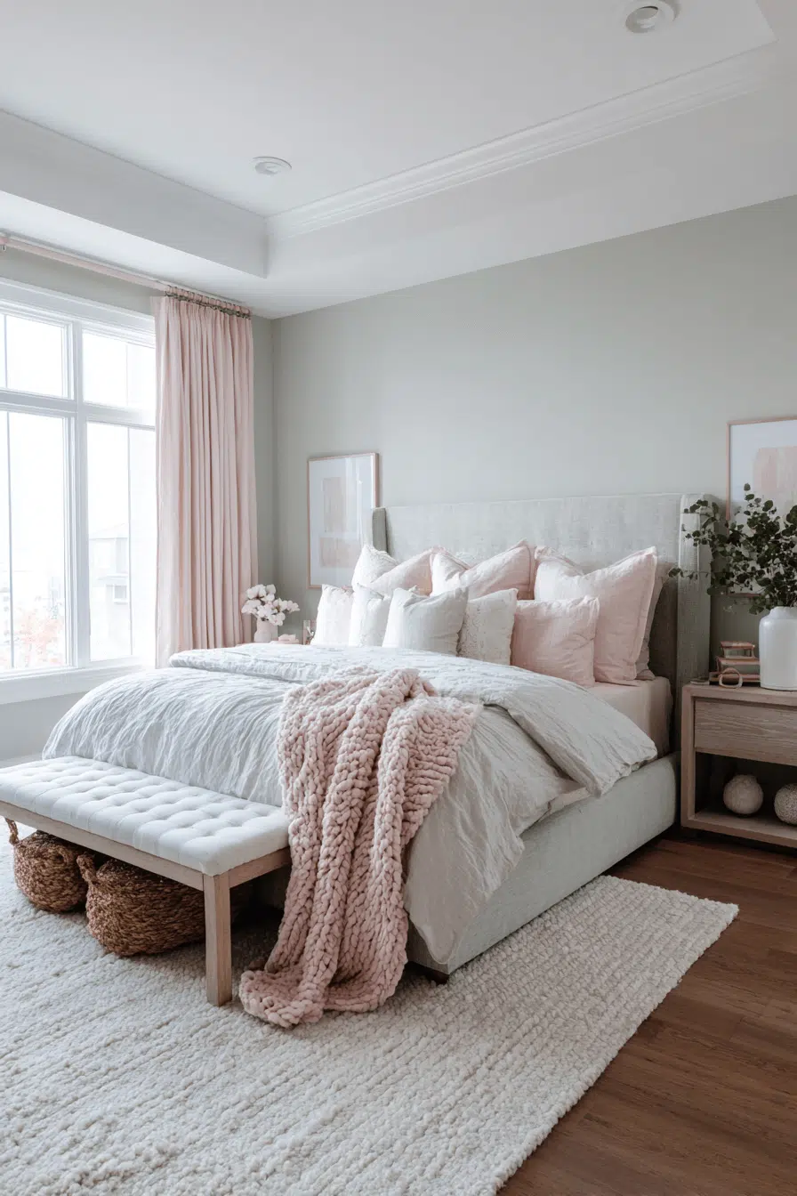 Warm peach-pink accents introduce subtle energy into a sage green and pink bedroom. The warmer undertone complements sage’s cool calm. Neutral textures tie everything together seamlessly. The space feels inviting and fresh. It’s cozy without feeling heavy. Click to warm up your bedroom palette!