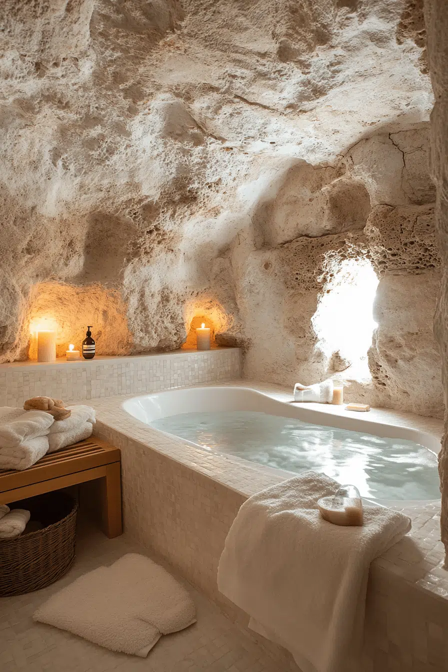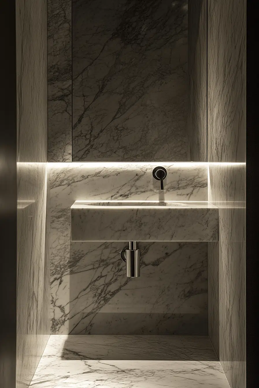Natural stone influences bring understated luxury to a small bathroom aesthetic through texture and depth. Soft veining and muted tones add character without overwhelming the space. Simple fixtures allow the material to remain the focal point. The look feels refined and timeless. It is a subtle way to introduce elegance. Explore stone-inspired ideas that enrich your small bathroom aesthetic.
