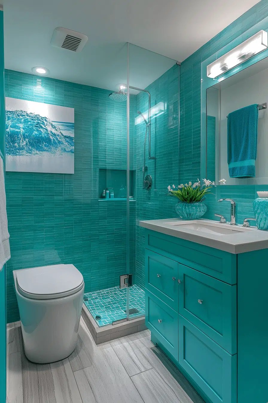 Strategic use of bold color adds structure and personality to a small bathroom aesthetic. Color zoning visually defines areas without adding walls or barriers. Balanced neutrals prevent the design from feeling overwhelming. The result feels playful yet controlled. This technique adds depth without sacrificing space. Discover creative color strategies for your small bathroom aesthetic.