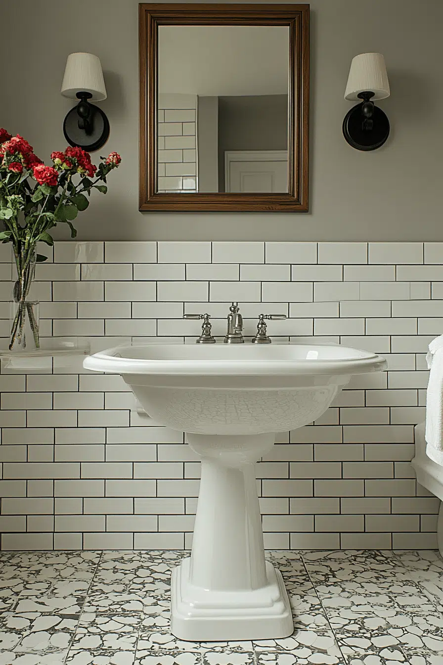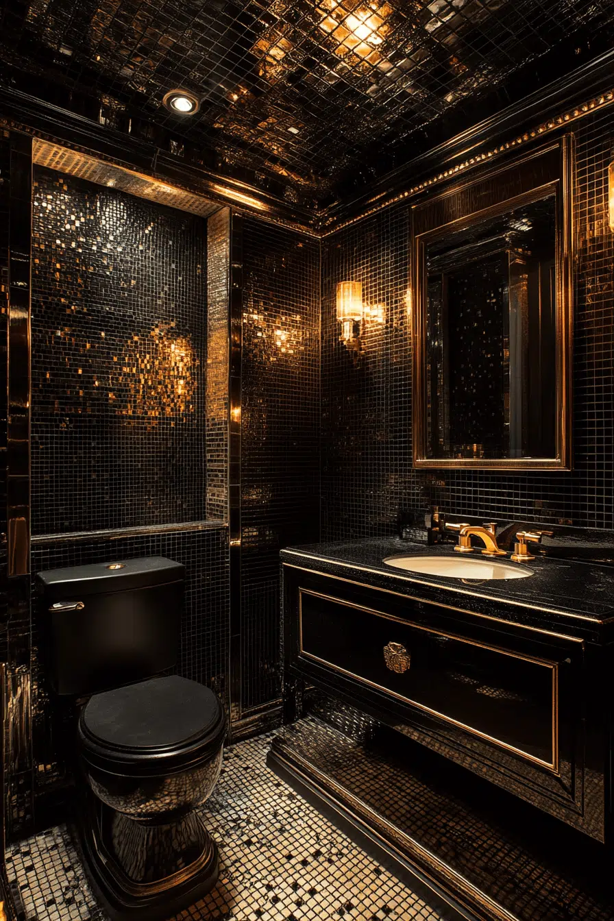 Decorative glamour introduces character into a small bathroom aesthetic without excess. Metallic finishes and structured patterns add visual richness. Vertical details help the room feel taller. The design feels refined rather than heavy. Vintage influence meets modern restraint. Explore glamorous accents that enhance your small bathroom aesthetic.