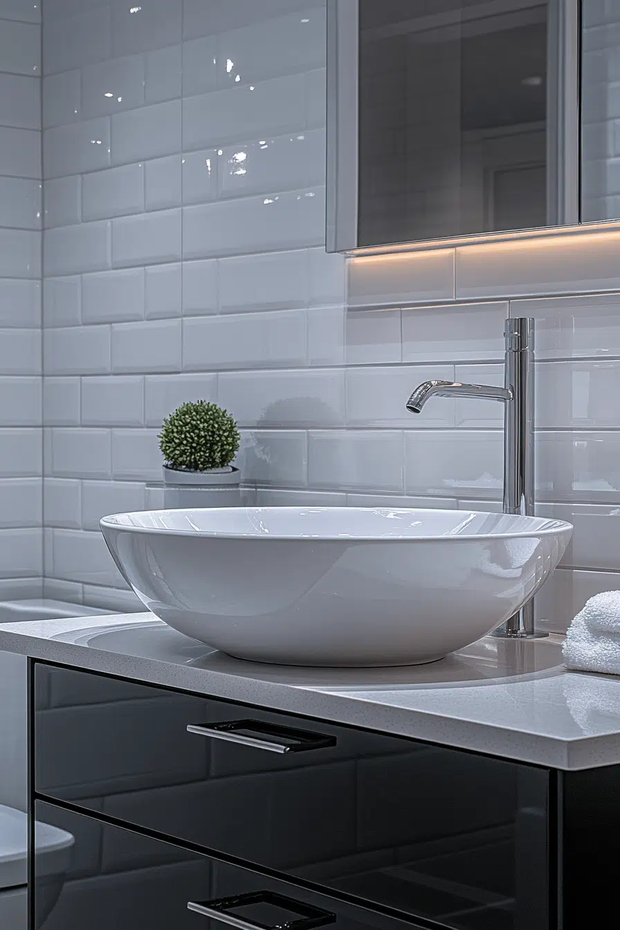 Reflective finishes amplify a small bathroom aesthetic by enhancing light and spatial depth. Glossy tiles and smooth surfaces help the room feel brighter and more expansive. Neutral tones keep the shine elegant rather than overpowering. The result feels clean and contemporary. This finish adds energy without clutter. Explore polished surface ideas that boost your small bathroom aesthetic.