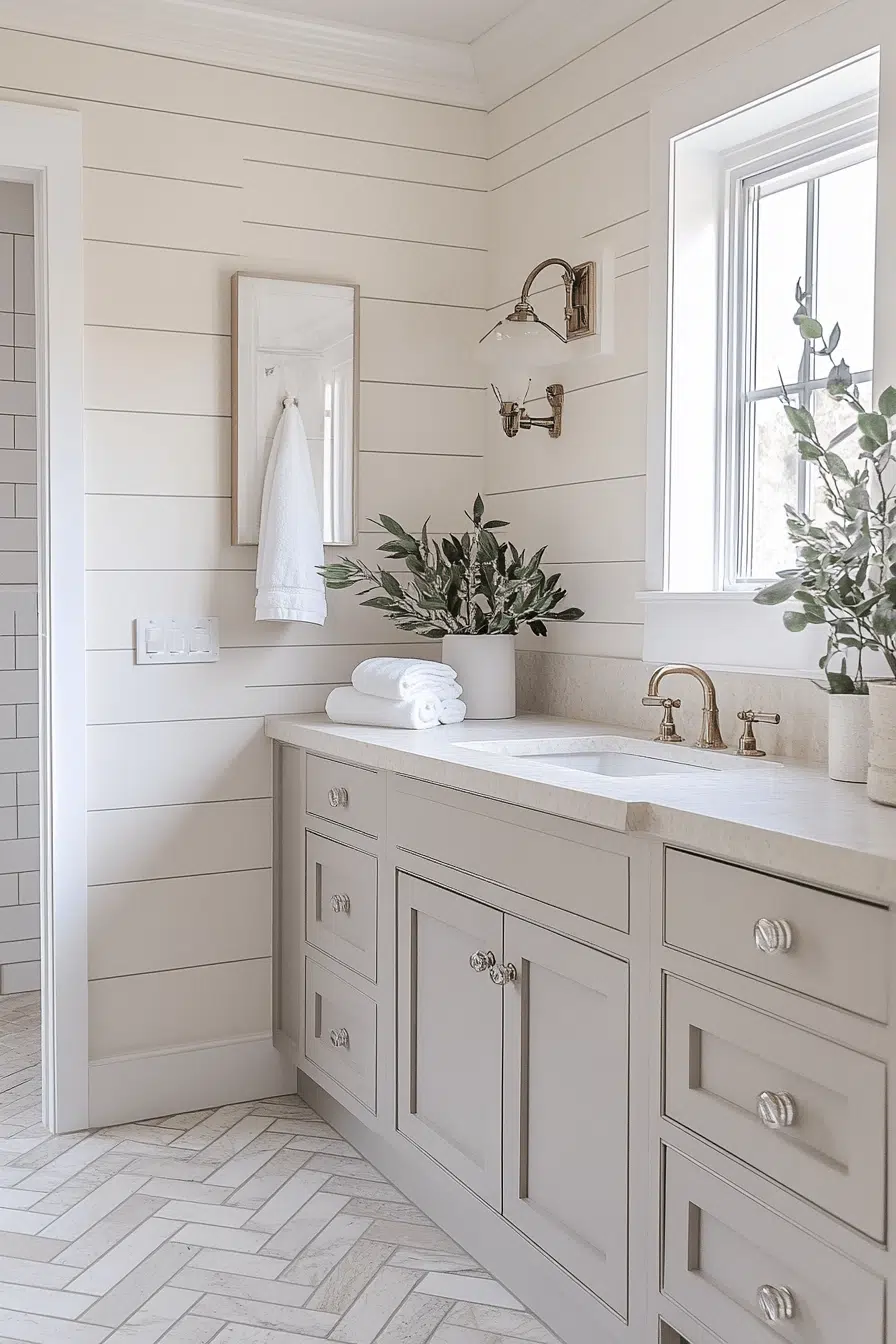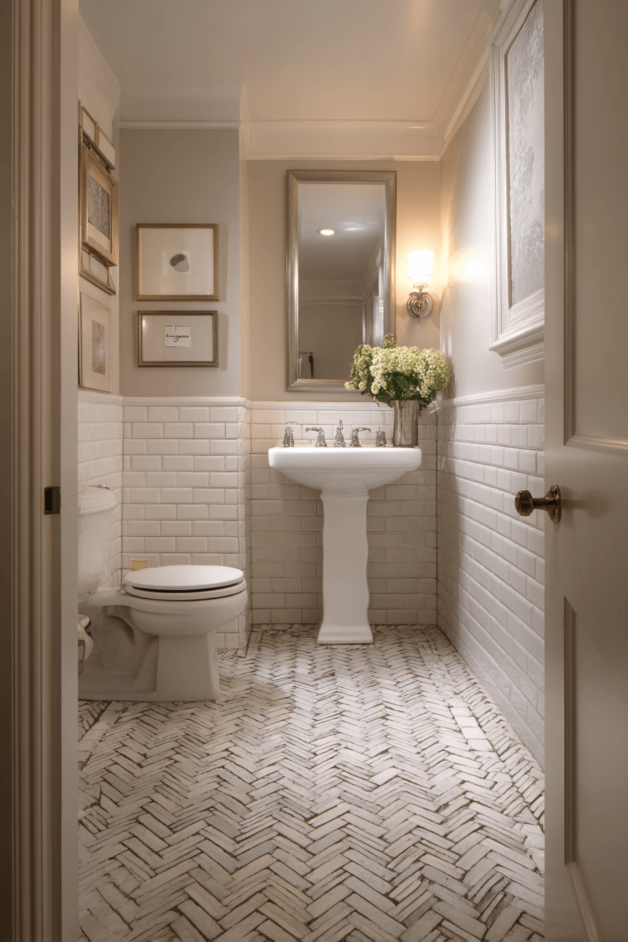 Graceful herringbone layouts enhance small bathroom tile ideas through elegant motion. The zigzag pattern guides the eye naturally across the space. This layout works beautifully with ceramic, porcelain, or stone tiles. Traditional charm blends seamlessly with modern design. Visual flow improves without clutter. Explore herringbone tile ideas that add movement and refinement to small bathrooms!