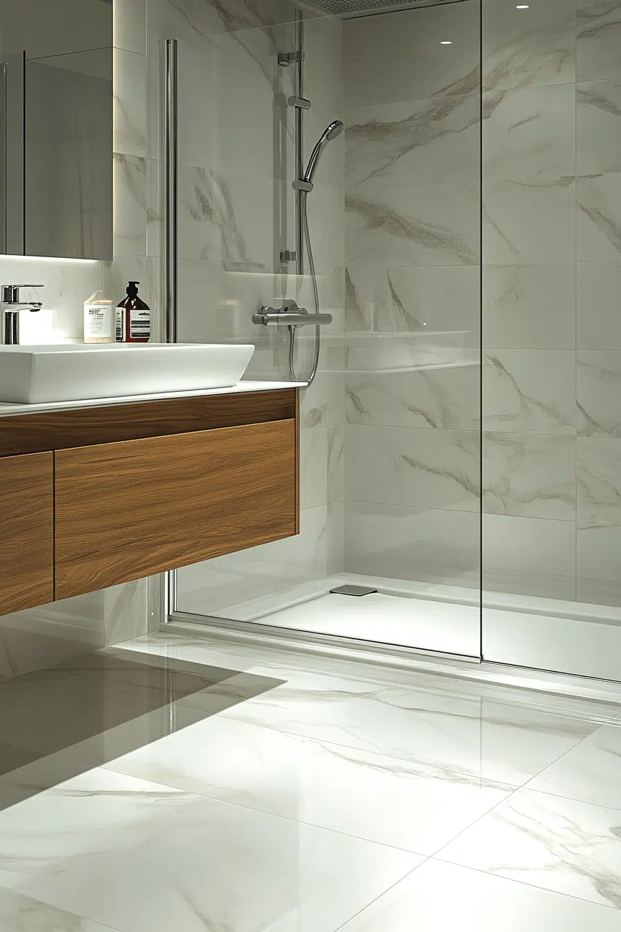 Marble-inspired porcelain tiles elevate small bathroom tile ideas with timeless beauty. Delicate veining adds luxury without demanding maintenance. Porcelain construction ensures durability in moisture-rich environments. Floor and wall continuity enhances visual harmony. Light tones increase brightness and openness. Discover marble-look tile ideas that bring elegance to compact bathrooms!