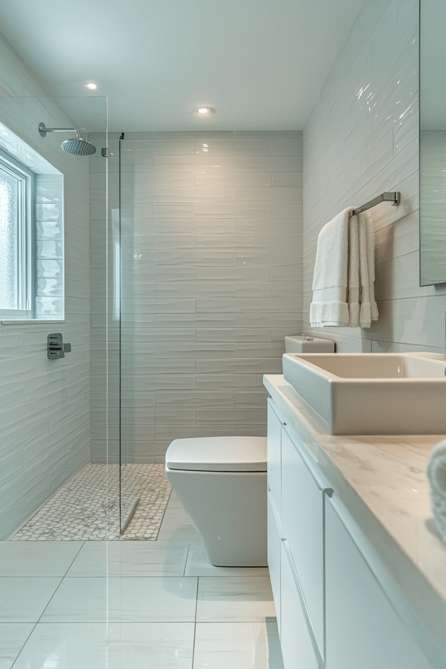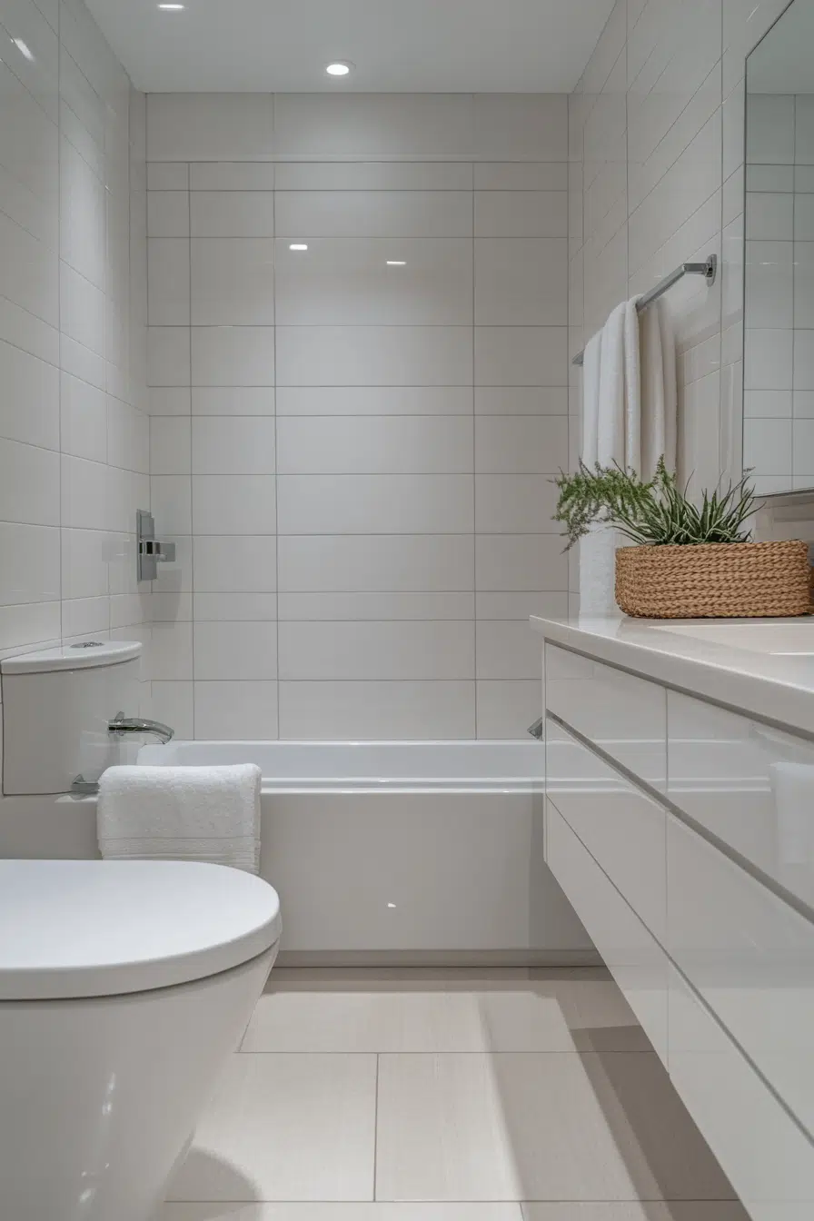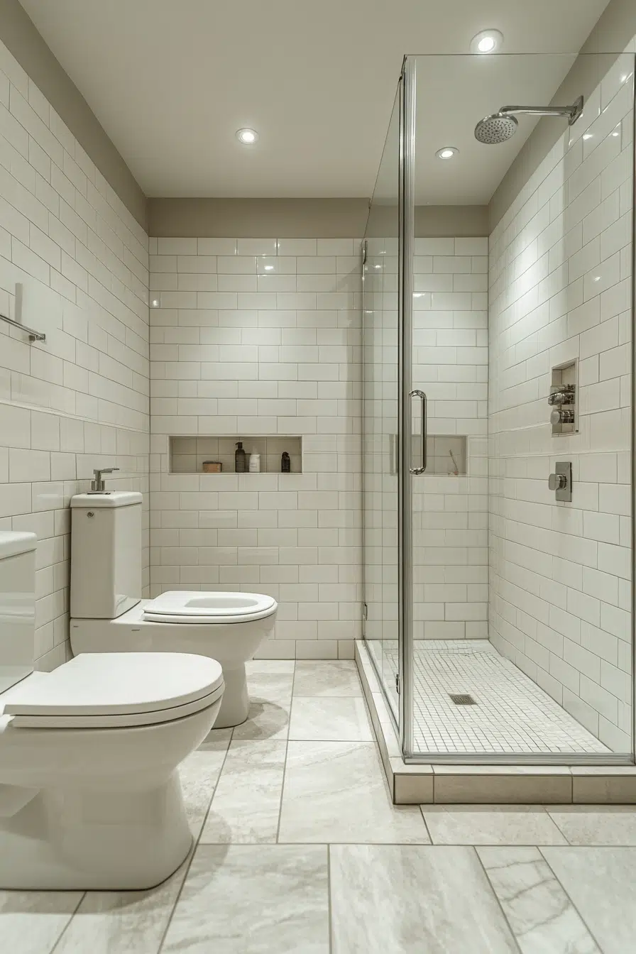 Bright white tile applications strengthen small bathroom tile ideas by maximizing reflected light. Clean surfaces brighten the entire room instantly. Soft grout choices maintain seamless transitions between tiles. White tiles provide a neutral canvas for colorful accents. The look remains fresh and adaptable. Explore white tile ideas that make small bathrooms feel open and inviting!