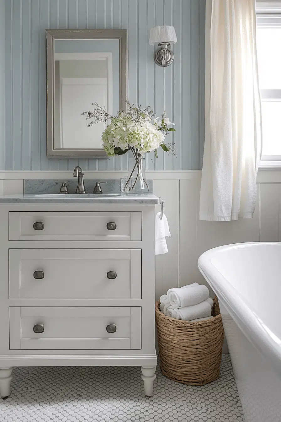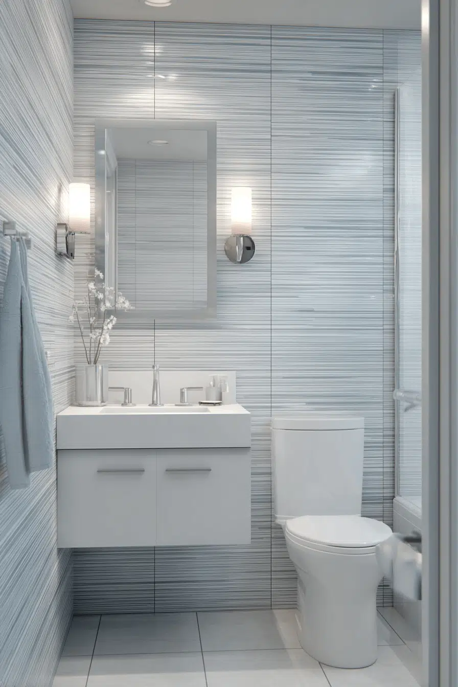 Cool-toned blue ceramic tiles complete small bathroom tile ideas with refreshing calm. Pale hues reflect light softly throughout the space. Crisp finishes enhance cleanliness and brightness. Metallic accents complement this palette beautifully. The atmosphere feels spa-inspired and serene. Explore blue tile ideas that refresh small bathrooms effortlessly!