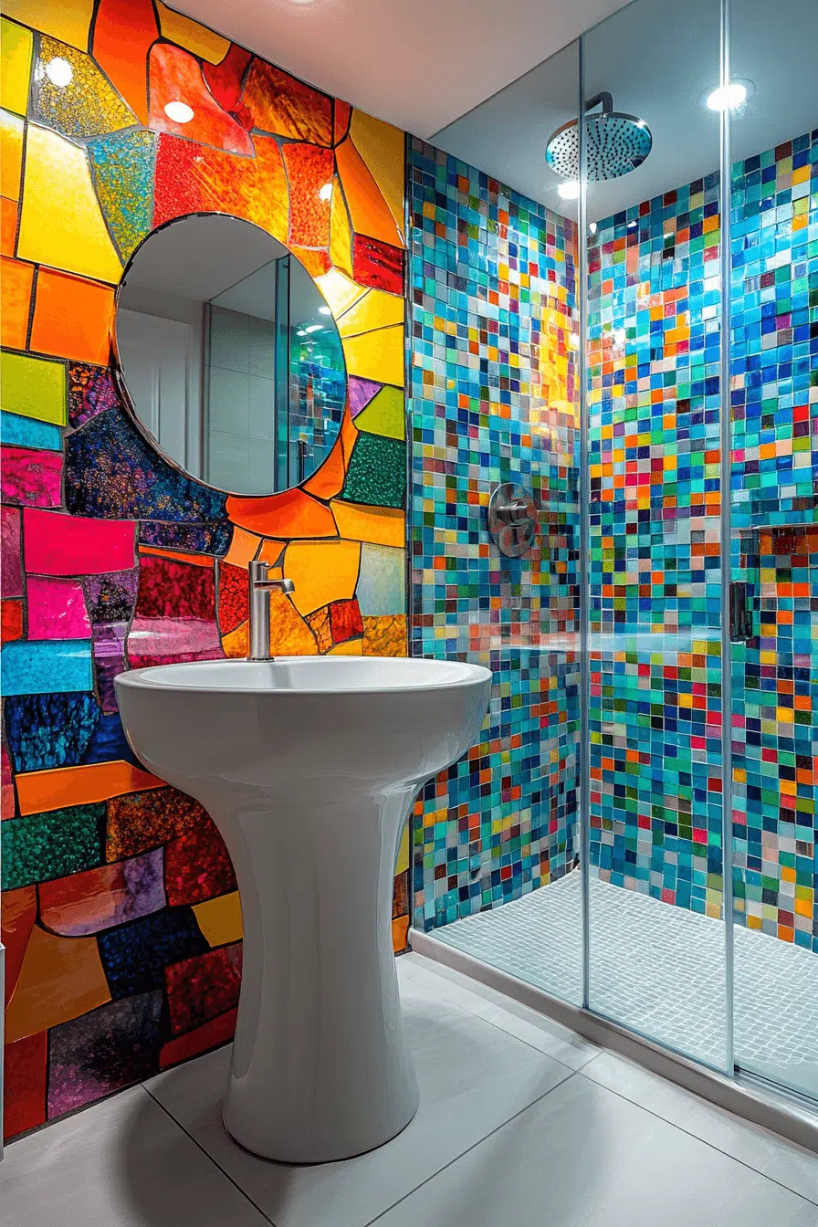 Light-enhancing glass mosaic tiles elevate small bathroom tile ideas by reflecting brightness across every surface. Their glossy finish helps compact bathrooms feel more open and energized. These tiles work especially well as feature walls, niches, or backsplash accents. Available in soft neutrals or bold colors, they adapt easily to different styles. Visual depth increases without adding heaviness. Discover glass mosaic tile ideas that make small bathrooms glow with style!