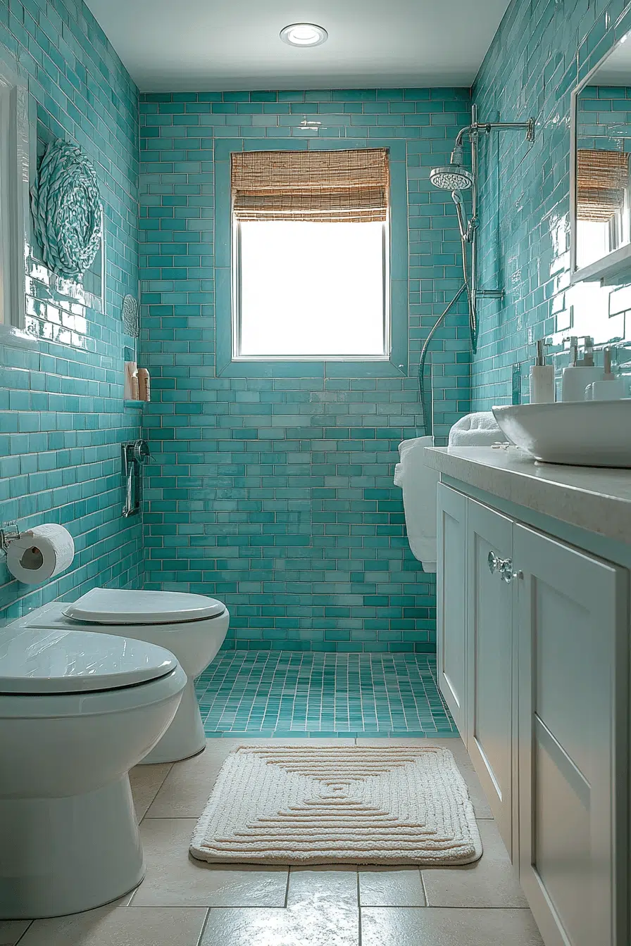 Cool ocean-toned tiles refresh small bathroom tile ideas with calming color. Blues and greens evoke serenity and openness. Glossy finishes enhance reflected light. Feature walls and showers shine with this palette. The mood feels tranquil and inviting. Explore ocean-inspired tile ideas that bring coastal calm indoors!