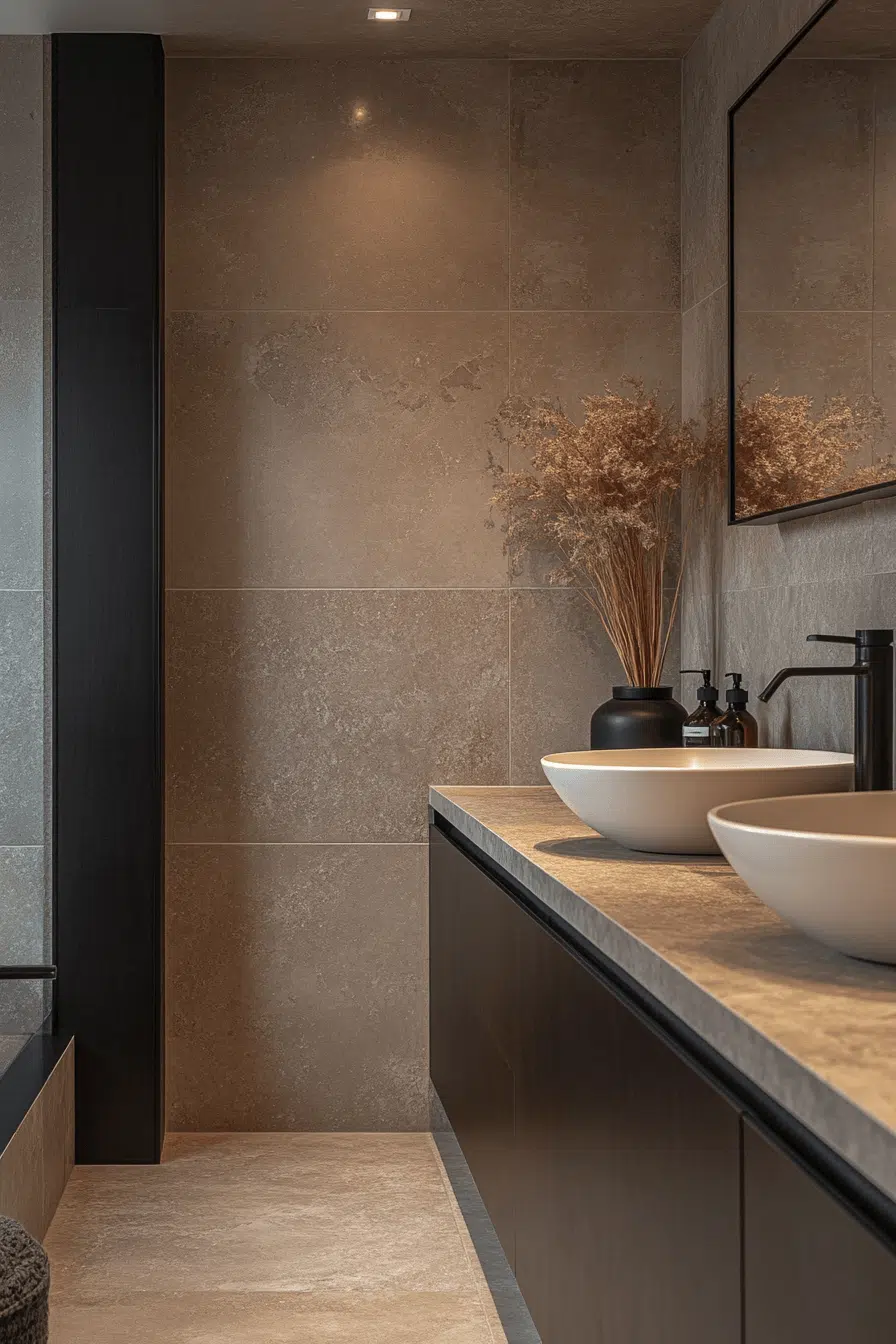 Oversized tiles modernize small bathroom tile ideas by reducing visual interruption. Fewer grout lines create a smooth, continuous appearance. Large tiles enhance openness on both walls and floors. Contemporary finishes reinforce a sleek aesthetic. Compact bathrooms feel less fragmented. Explore large-format tile ideas that expand visual space with ease!