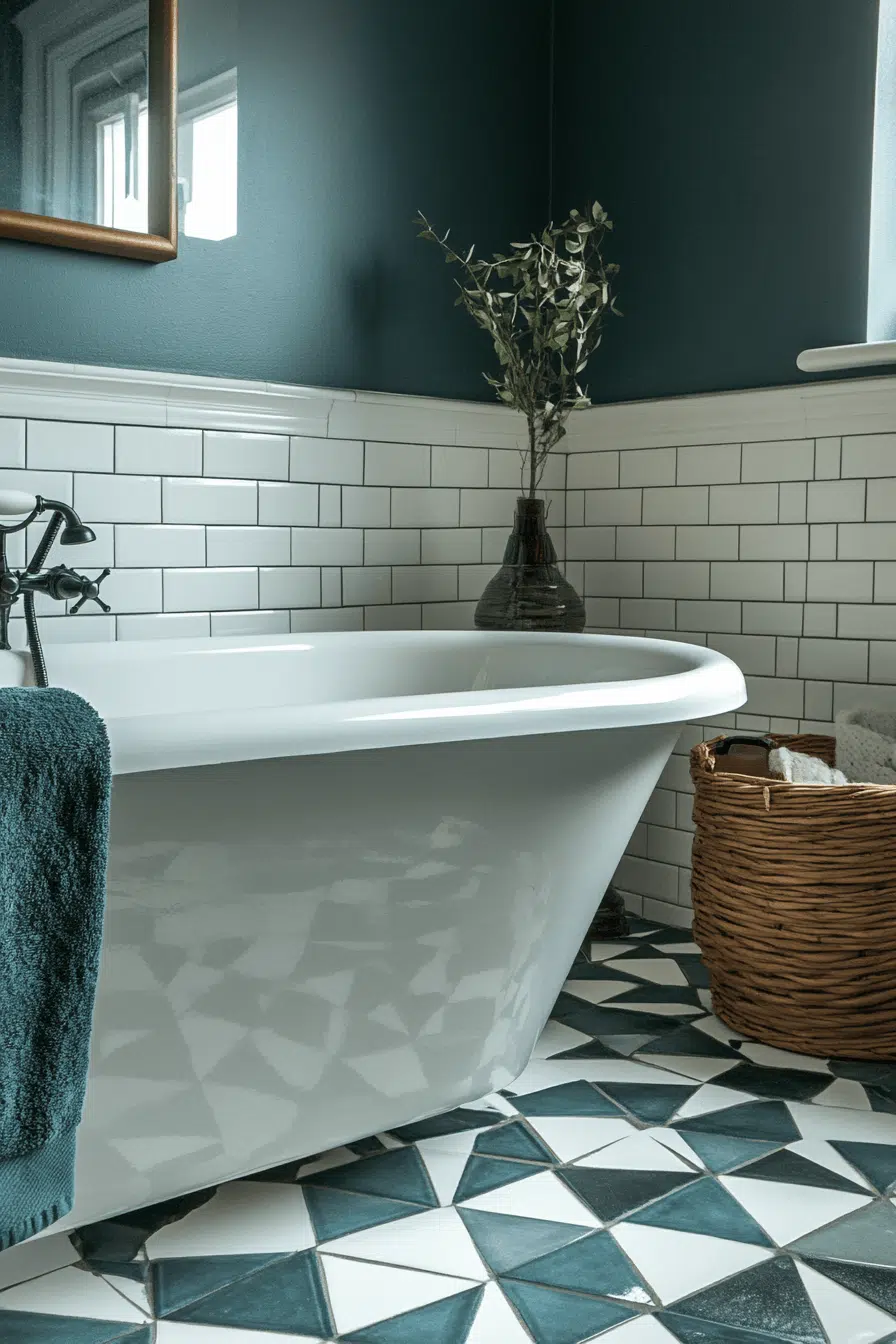 Creative geometric patterns energize small bathroom tile ideas with rhythm and structure. Shapes like hexagons and scallops introduce modern personality. Color choices range from bold statements to subtle sophistication. Compact spaces benefit from this visual engagement. Feature walls and floors shine with this approach. Discover geometric tile designs that bring artistic flair to small bathrooms!