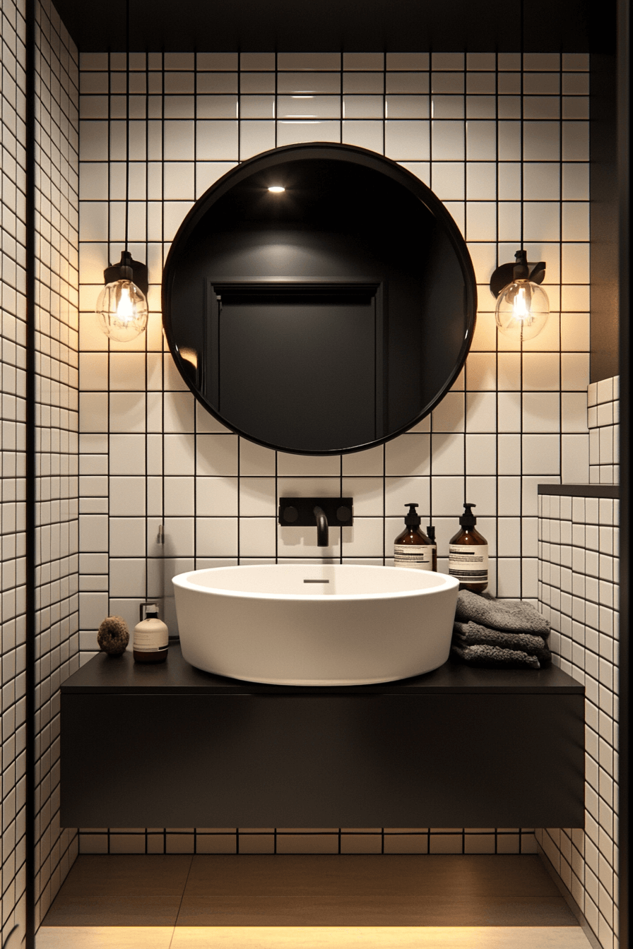 Clean contrast plays a powerful role in small bathroom tile ideas when monochrome palettes are used thoughtfully. Black and white tiles define the space clearly while keeping the overall look sharp and uncluttered. This color pairing works beautifully with modern fixtures and streamlined accessories. Pattern choices like stacked grids or subtle checker layouts add visual interest without chaos. The bathroom feels intentional, balanced, and effortlessly stylish. Explore monochrome tile designs that bring clarity and confidence to small bathrooms!