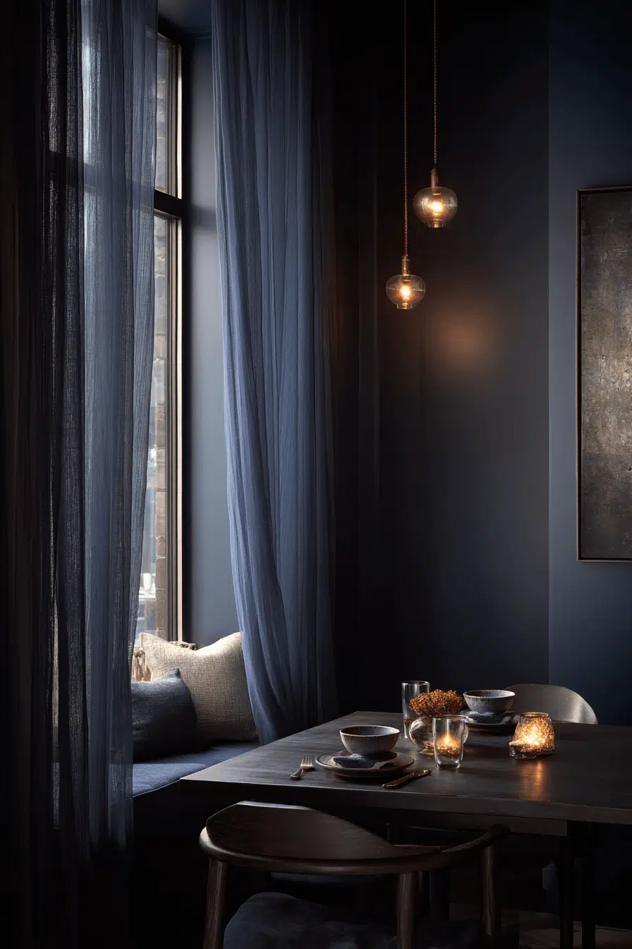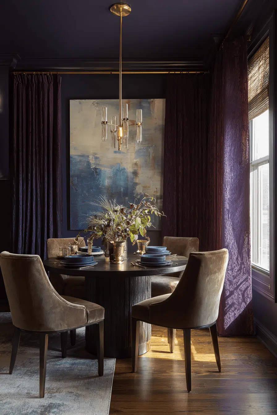 Dark hues and layered lighting define these dramatic small dining room ideas. Deep colors add richness while metallic accents bring warmth. The layout remains compact and intentional. It’s ideal for bold, stylish interiors. The mood feels cozy and elevated. Experiment with darker tones today!