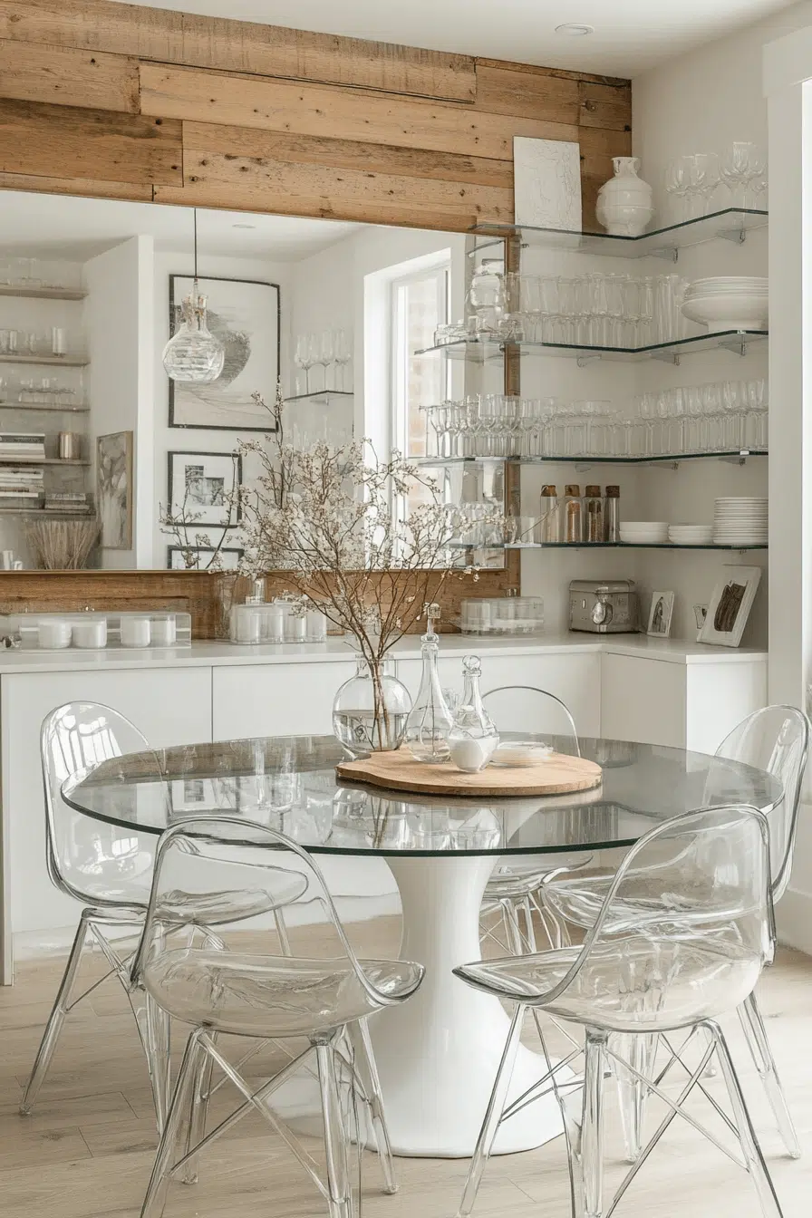 Glossy finishes and subtle shimmer elevate these small dining room ideas with effortless style. Transparent furniture pieces maintain openness while adding sophistication. Neutral tones balance the shine for a polished look. The space feels bright, refined, and easy to enjoy. It proves elegance doesn’t require excess. Add a touch of shine to your dining room!