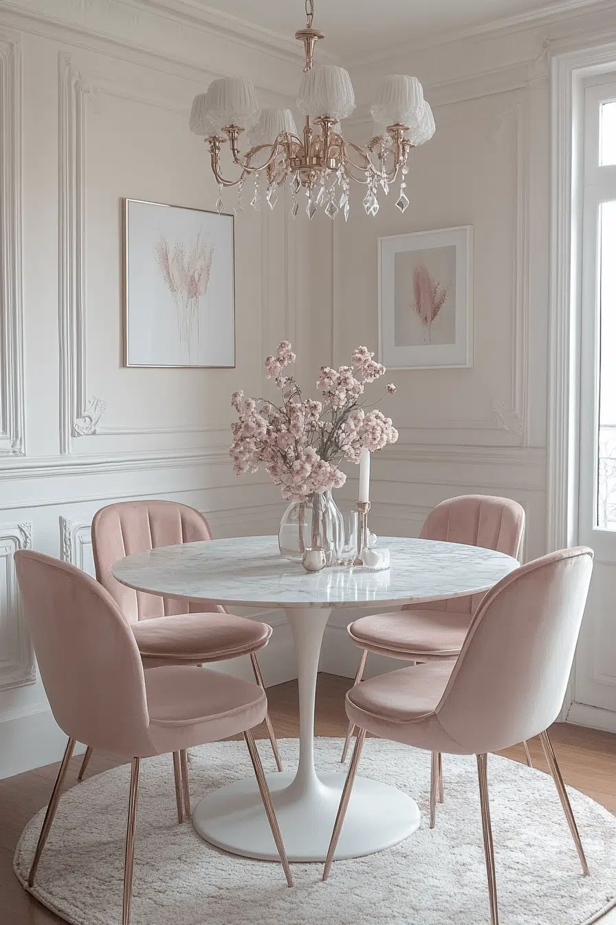 Blush tones and marble accents create a soft yet sophisticated look in these small dining room ideas. A marble table anchors the design with elegance. Light seating and metallic details keep everything cohesive. The palette feels delicate and polished. The result is both chic and inviting. Bring this refined style into your home!
