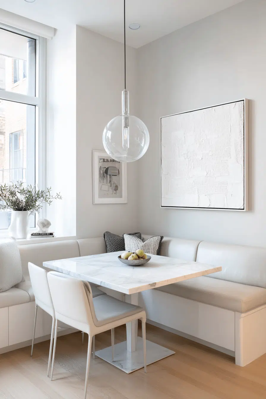 A unified color palette creates flow in these cohesive small dining room ideas. Matching tones across surfaces expand the visual space. The design feels calm and curated. Minimal variation keeps everything clean. The result is effortlessly stylish. Embrace monochrome simplicity today!