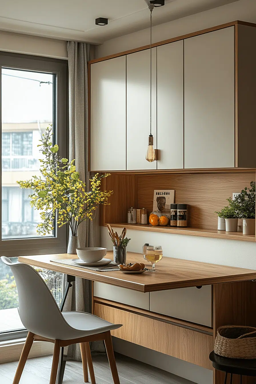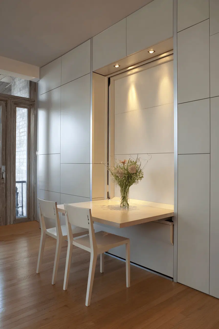 Fold-away furniture offers a stylish solution for compact small dining room ideas. Tables and chairs can be tucked away when not in use. Smooth finishes keep the look modern and polished. The design is ideal for tight spaces. Function meets flexibility seamlessly. Transform your dining space with this smart setup!
