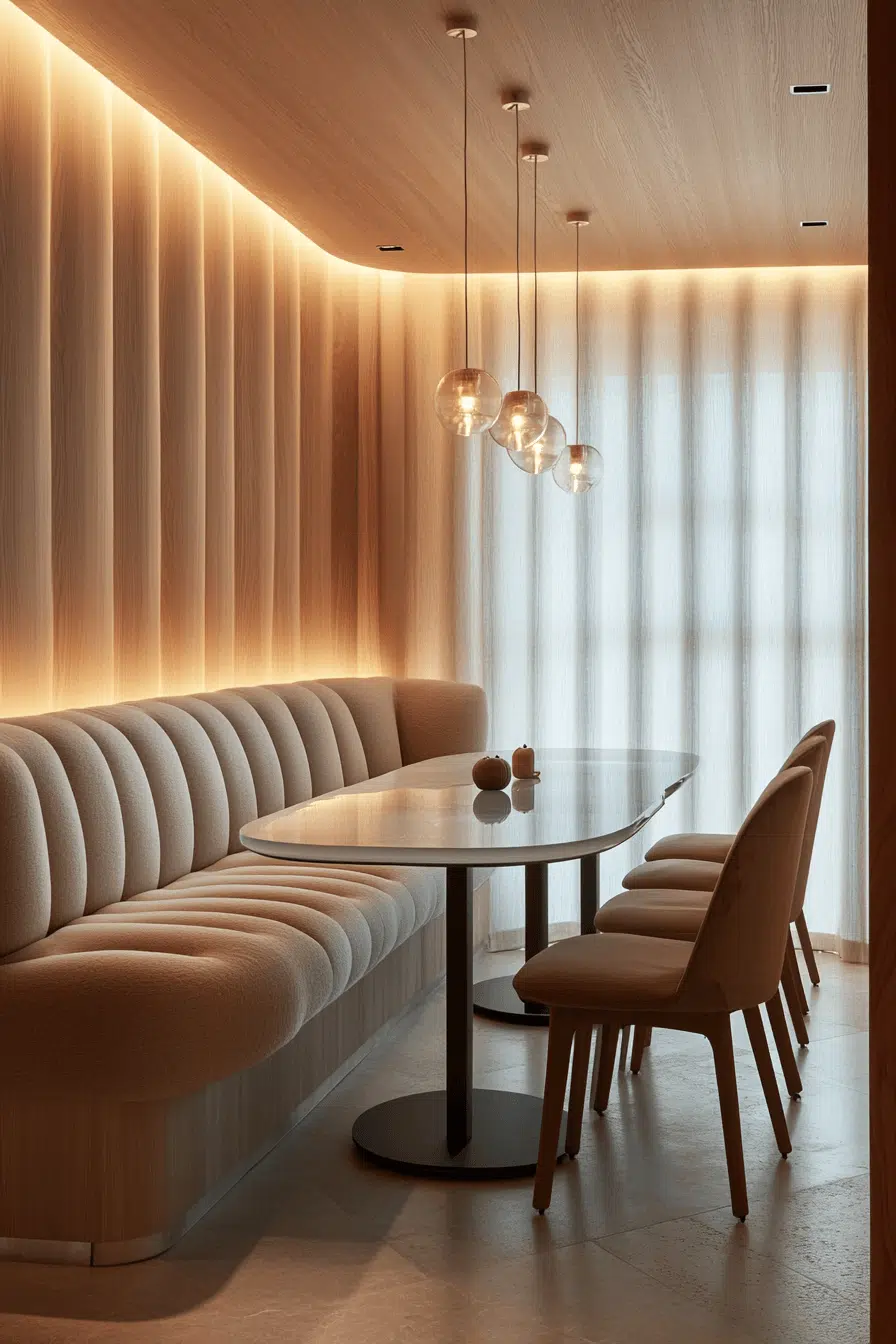 Soft underlighting creates depth and warmth in these glowing small dining room ideas. A compact booth layout keeps everything efficient and cozy. Gentle tones enhance the inviting atmosphere. Lighting becomes a key design feature. The space feels modern and comfortable. See how lighting transforms your dining room!