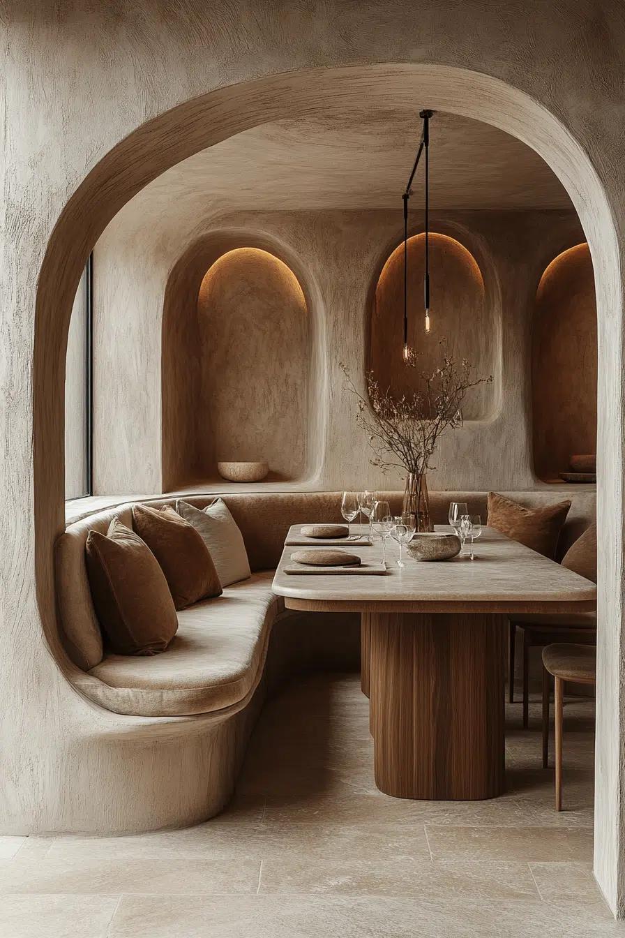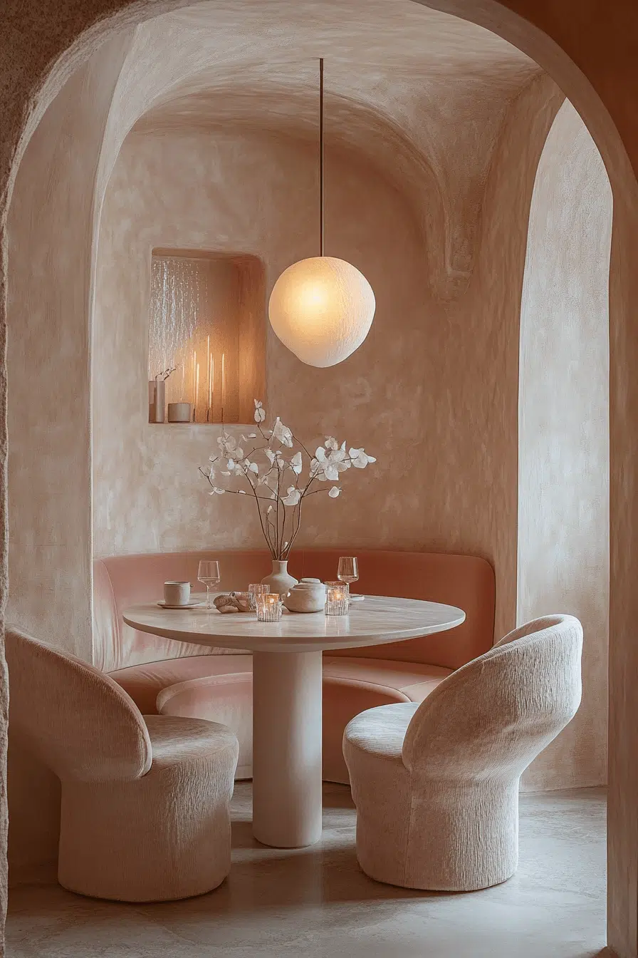 Rounded furniture and warm tones create a cocoon-like feel in these small dining room ideas. Curves flow seamlessly throughout the design. Soft lighting enhances the relaxed ambiance. The layout feels intimate yet functional. It’s perfect for cozy dining experiences. Turn your space into a welcoming retreat!