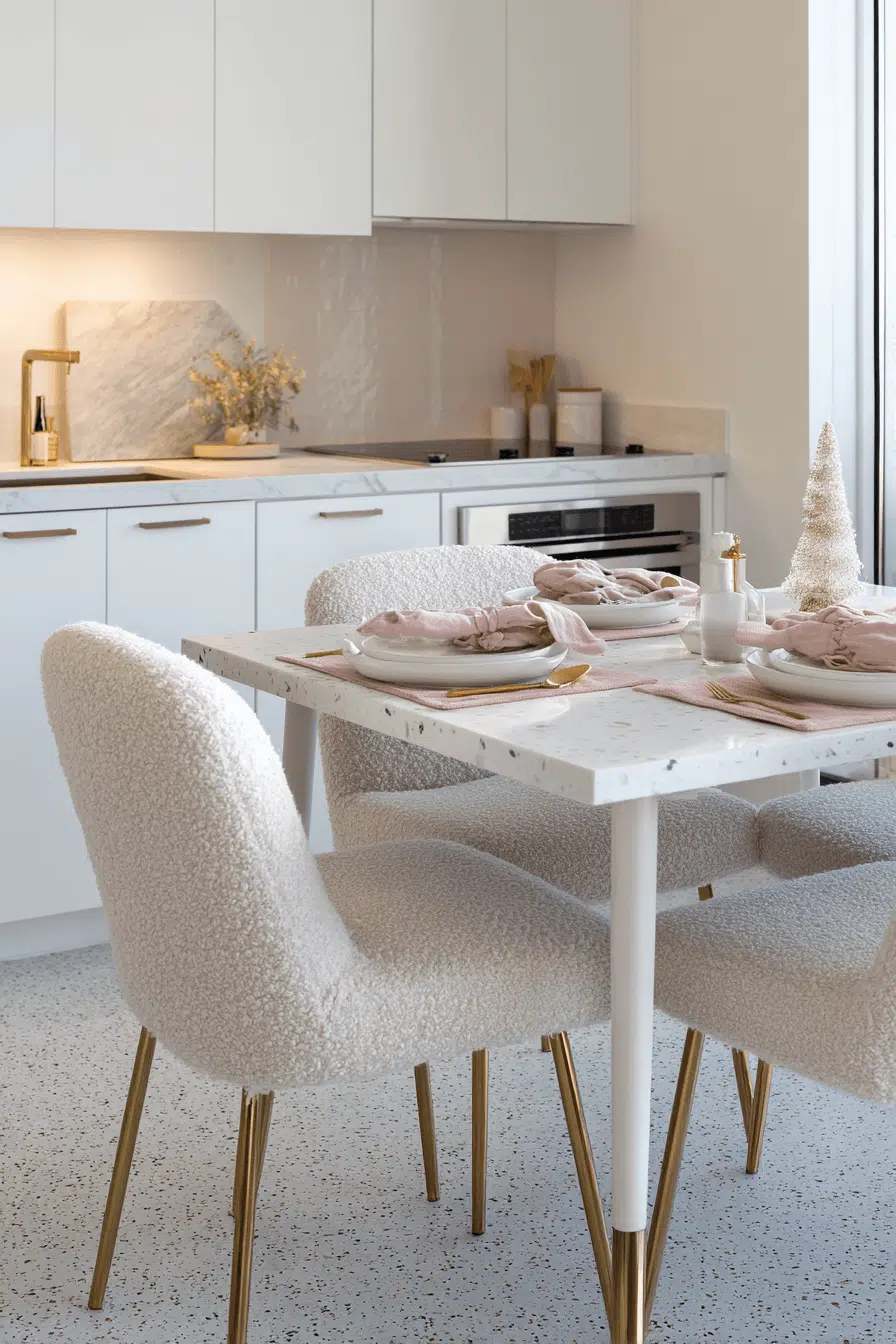 Quartz surfaces introduce durability and elegance to these refined small dining room ideas. The smooth finish adds subtle luxury. Neutral tones balance the cool texture. The design feels practical yet polished. It’s a timeless upgrade for any dining space. Refresh your room with quartz style!