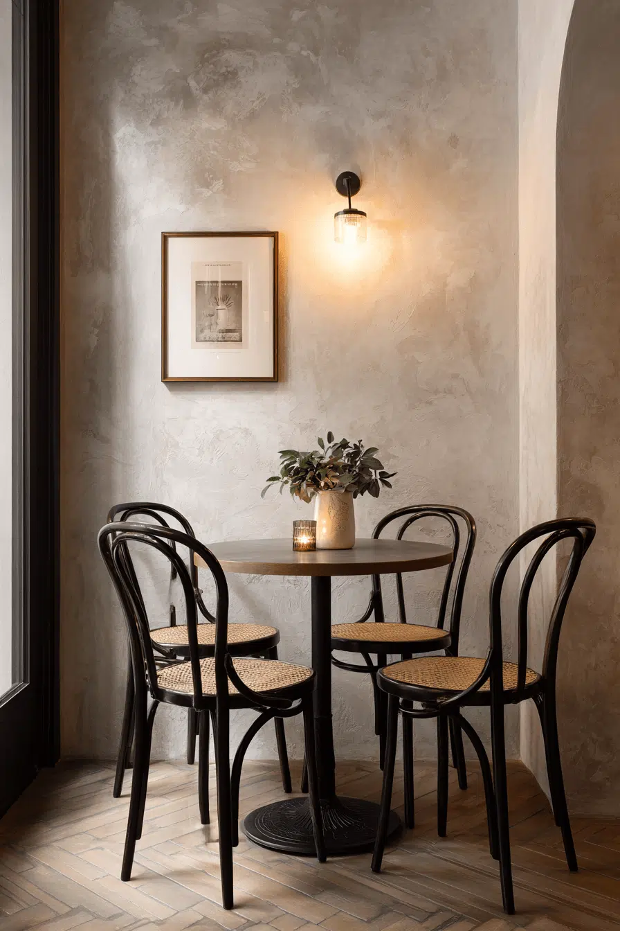 Soft matte textures bring warmth and depth to these cozy small dining room ideas. Light is gently diffused across surfaces, creating a relaxed and inviting mood. The muted palette enhances comfort while keeping the look refined. Each element contributes to a calm, balanced environment. It’s perfect for everyday dining. Embrace this soothing aesthetic in your home!