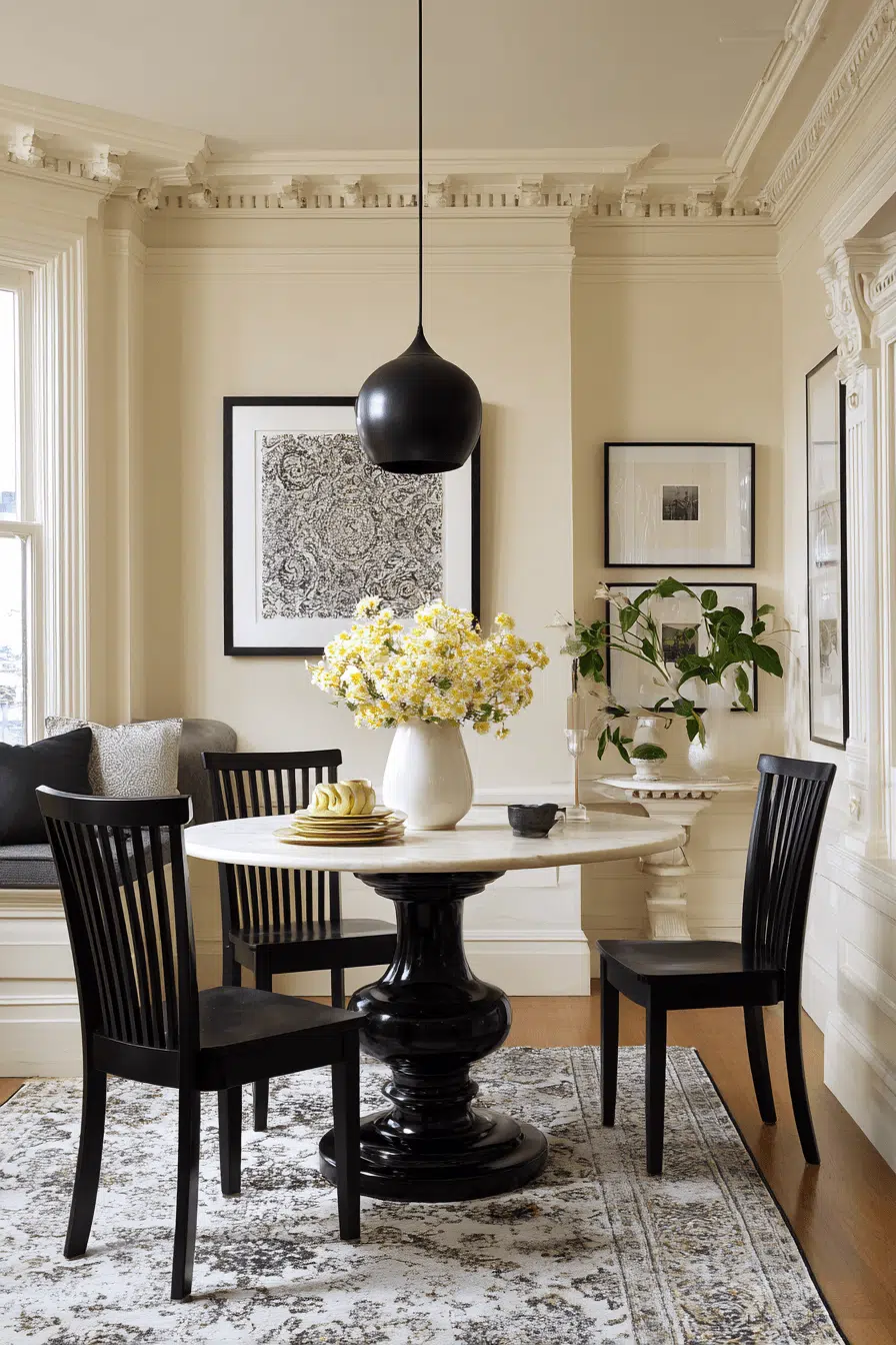Contrasting tones bring depth to these stylish small dining room ideas. Light walls keep the space open while darker furniture grounds it. The balance feels bold yet harmonious. A statement table anchors the design. The look is refined and eye-catching. Play with contrast in your space!