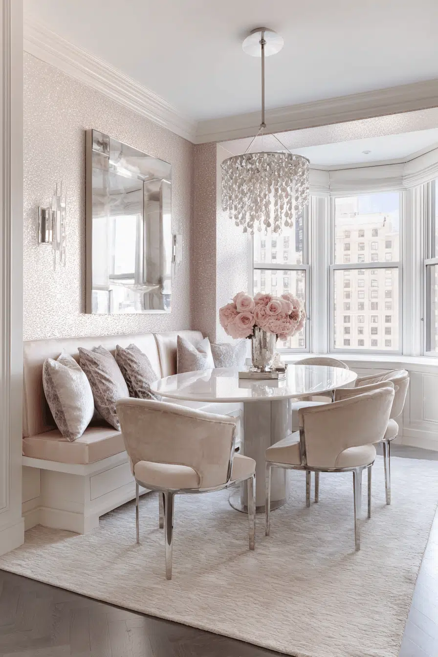 Subtle shimmer elevates these elegant small dining room ideas with a soft glow. Pearl-like finishes add refinement without excess. A compact table and plush seating enhance comfort. Lighting highlights every detail gently. The design feels luxurious yet understated. Add a hint of shimmer to your dining space!