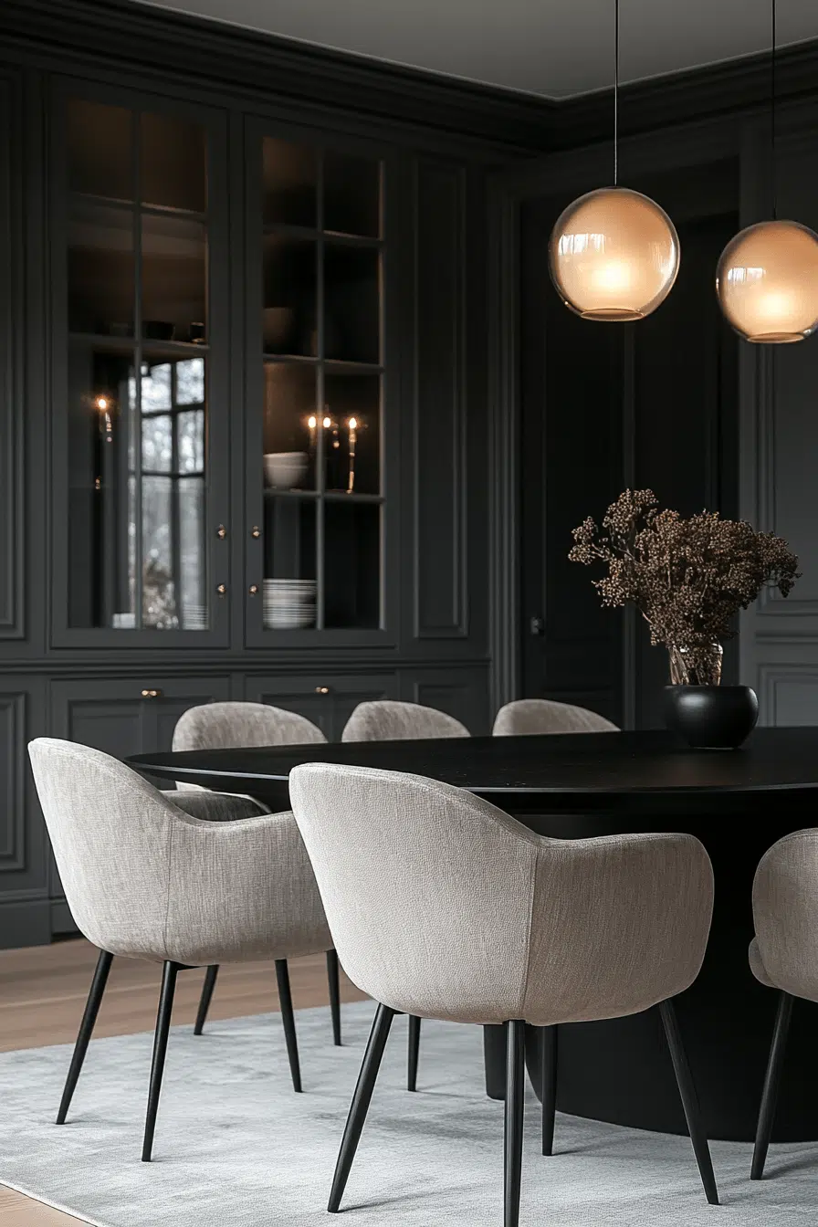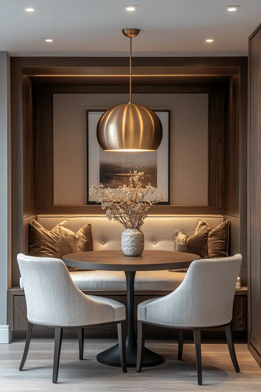 Deep tones and soft lighting create a moody, intimate atmosphere in these small dining room ideas. Dark surfaces add depth while plush textures enhance comfort. The setup feels cozy and sophisticated at the same time. It’s perfect for evening dining or relaxed gatherings. The design feels bold yet balanced. Bring this dramatic style into your space!