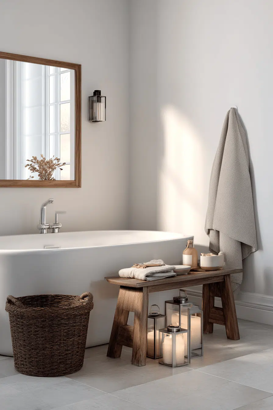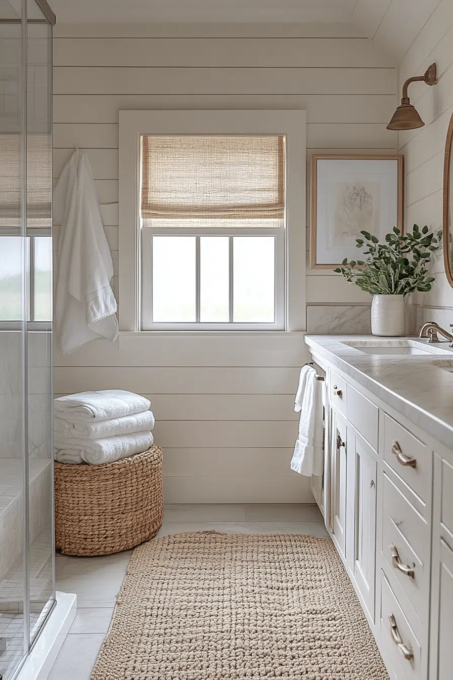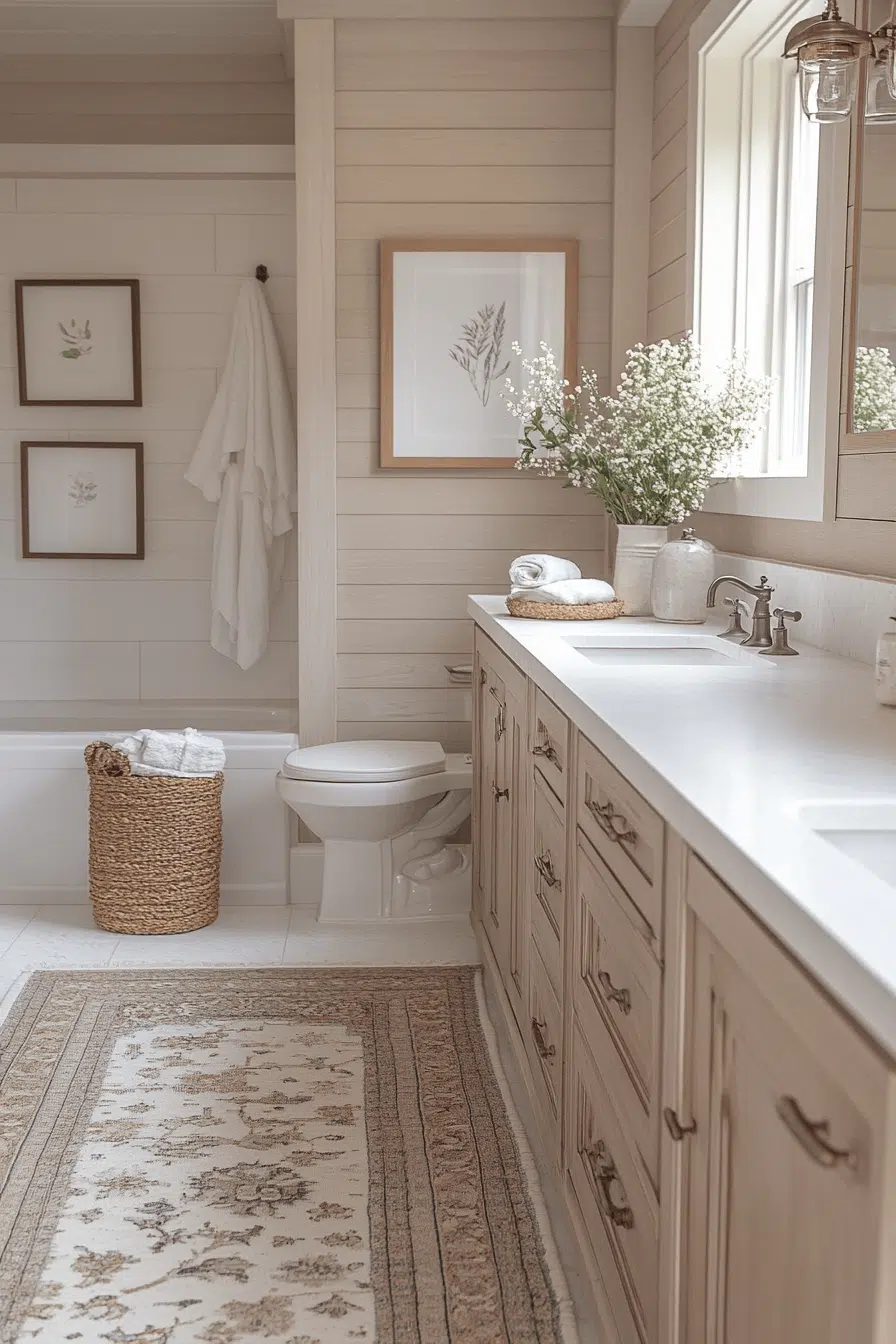 5. Neutral Cozy Layered Bathroom