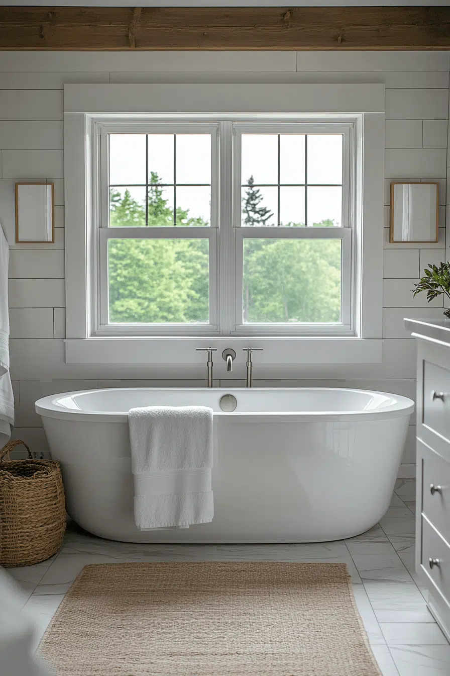 A classic tub becomes the highlight of this charming small farmhouse bathroom. Surrounding elements stay minimal for balance. Light colors enhance the sense of space. Subtle textures add warmth without distraction. The layout feels cozy yet functional. This small farmhouse bathroom offers timeless relaxation. Tap to explore this setup.
