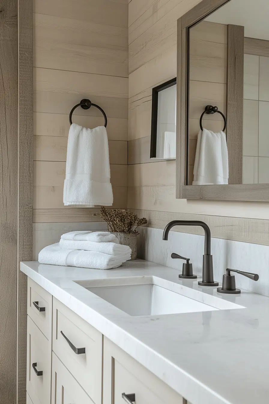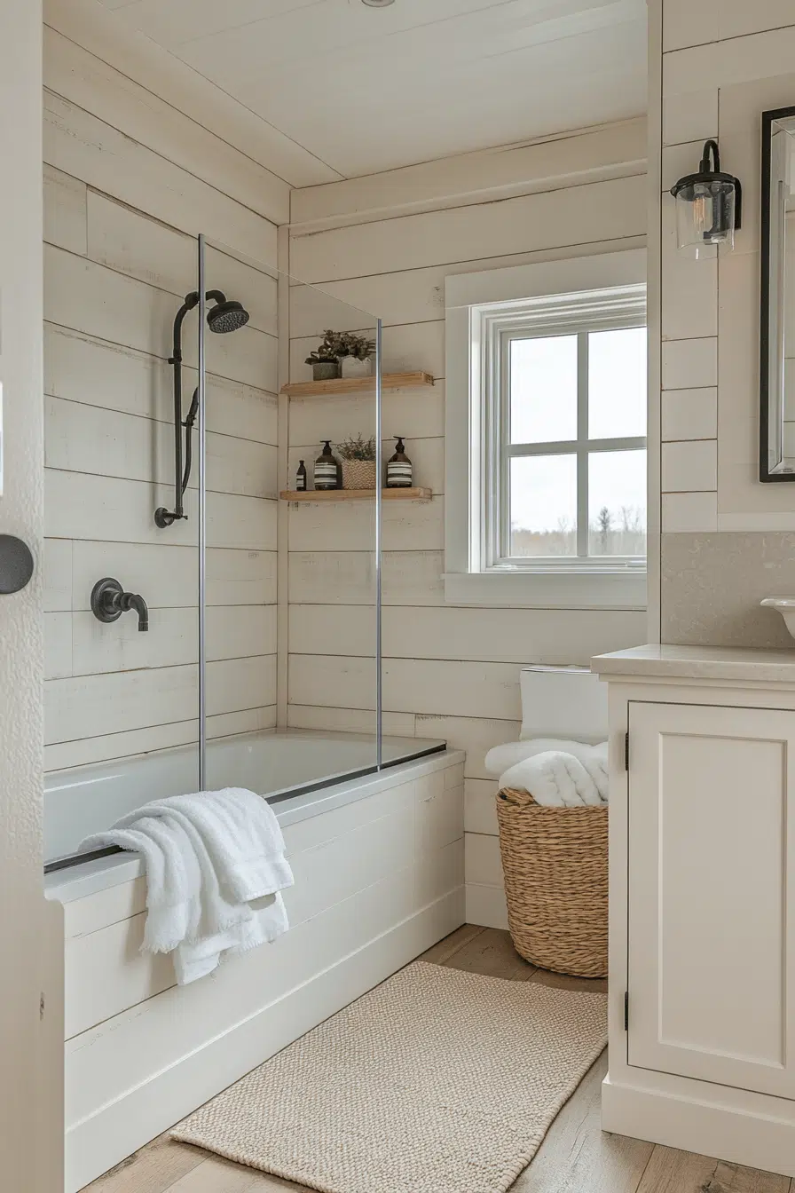 Clean lines paired with barn-style elements define this small farmhouse bathroom with modern rustic appeal. Shiplap walls and warm wood accents add texture while maintaining brightness. The layout stays minimal for a clutter-free feel. Soft lighting enhances the natural palette. Dark hardware adds contrast without overpowering the design. This small farmhouse bathroom feels fresh, balanced, and easy to love. Click to discover this look.