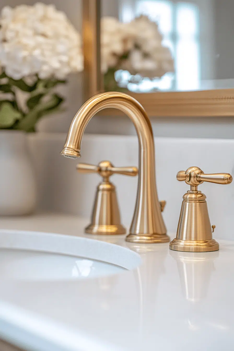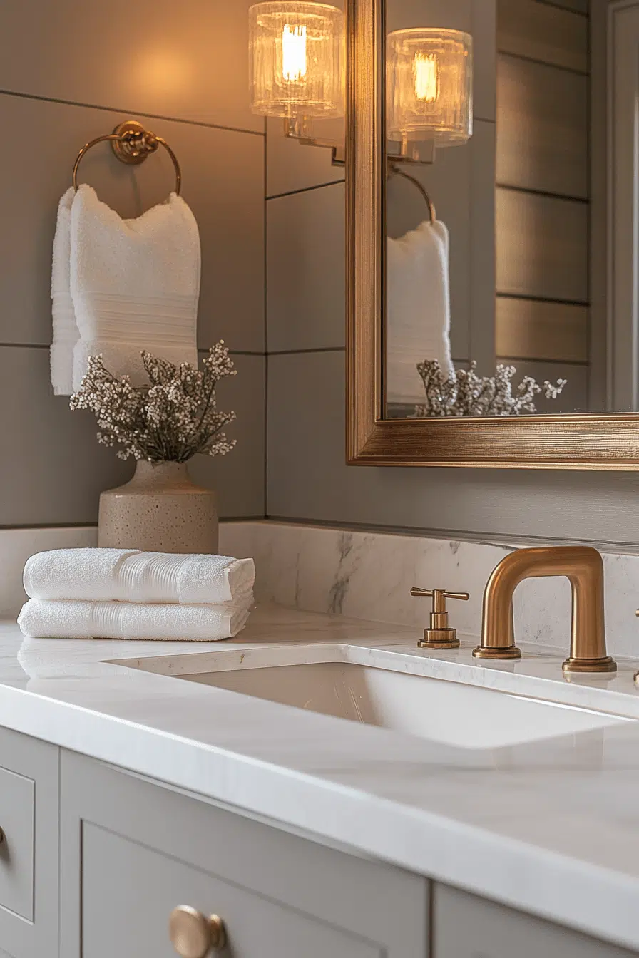 Warm metallic finishes highlight small guest bathroom ideas with a refined and elegant glow. Brass fixtures add instant warmth and visual interest against neutral backdrops. Light reflects off the surfaces to create depth and dimension. Clean lines keep the overall look modern and uncluttered. Paired with soft textures, the design feels balanced and inviting. Add a touch of metallic charm to elevate your space!