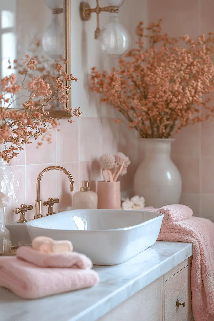 Blush tones soften small guest bathroom ideas with a gentle, romantic atmosphere that feels warm and uplifting. Paired with light neutrals, the palette stays balanced and fresh. Subtle textures through tile or fabrics add dimension. Warm lighting enhances the rosy tones beautifully. Small decor accents keep everything polished and cohesive. The space feels cozy and inviting. Bring soft color into your bathroom design!