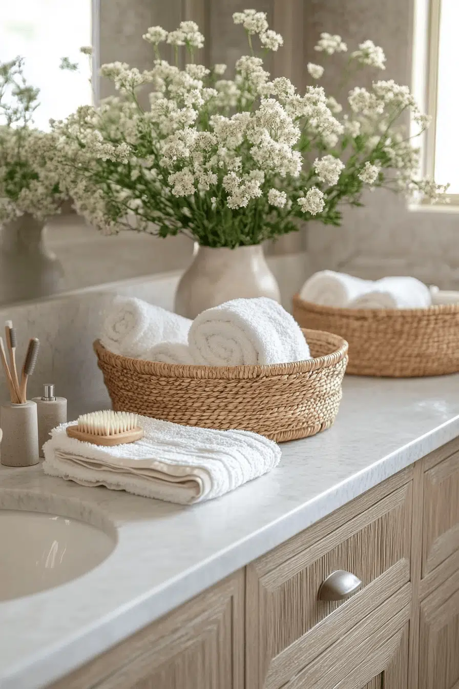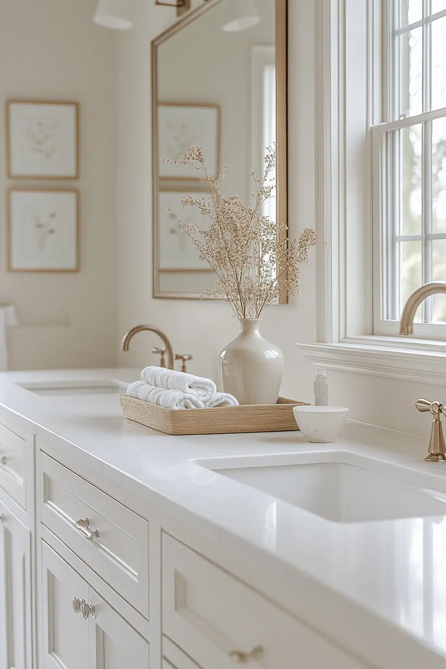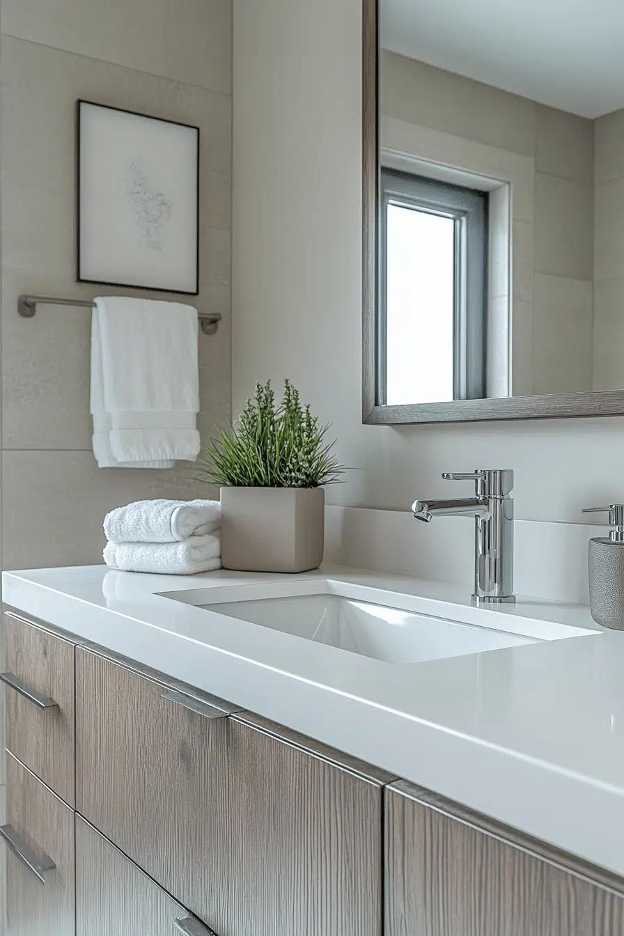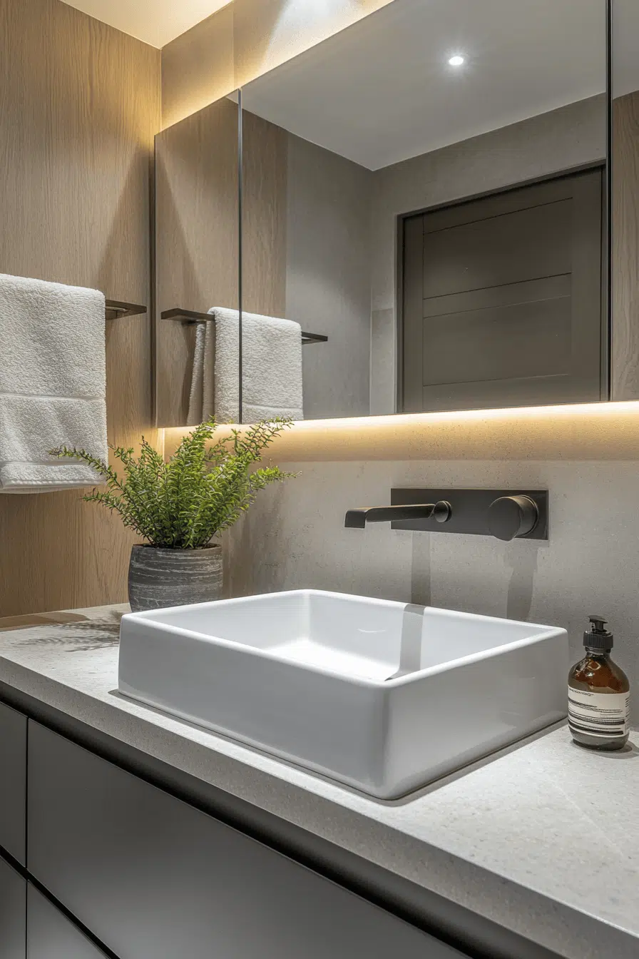This bright vanity corner embraces small guest bathroom ideas that prioritize openness, light, and simplicity. A floating vanity paired with a large mirror creates the illusion of a more spacious layout. Soft whites, pale greiges, and natural tones enhance brightness and keep the space feeling fresh. Minimal styling allows the room to breathe, while small accents like a ceramic tray or folded towels add charm. Smooth finishes reinforce the relaxed, modern aesthetic. Get inspired to open up your own compact space!