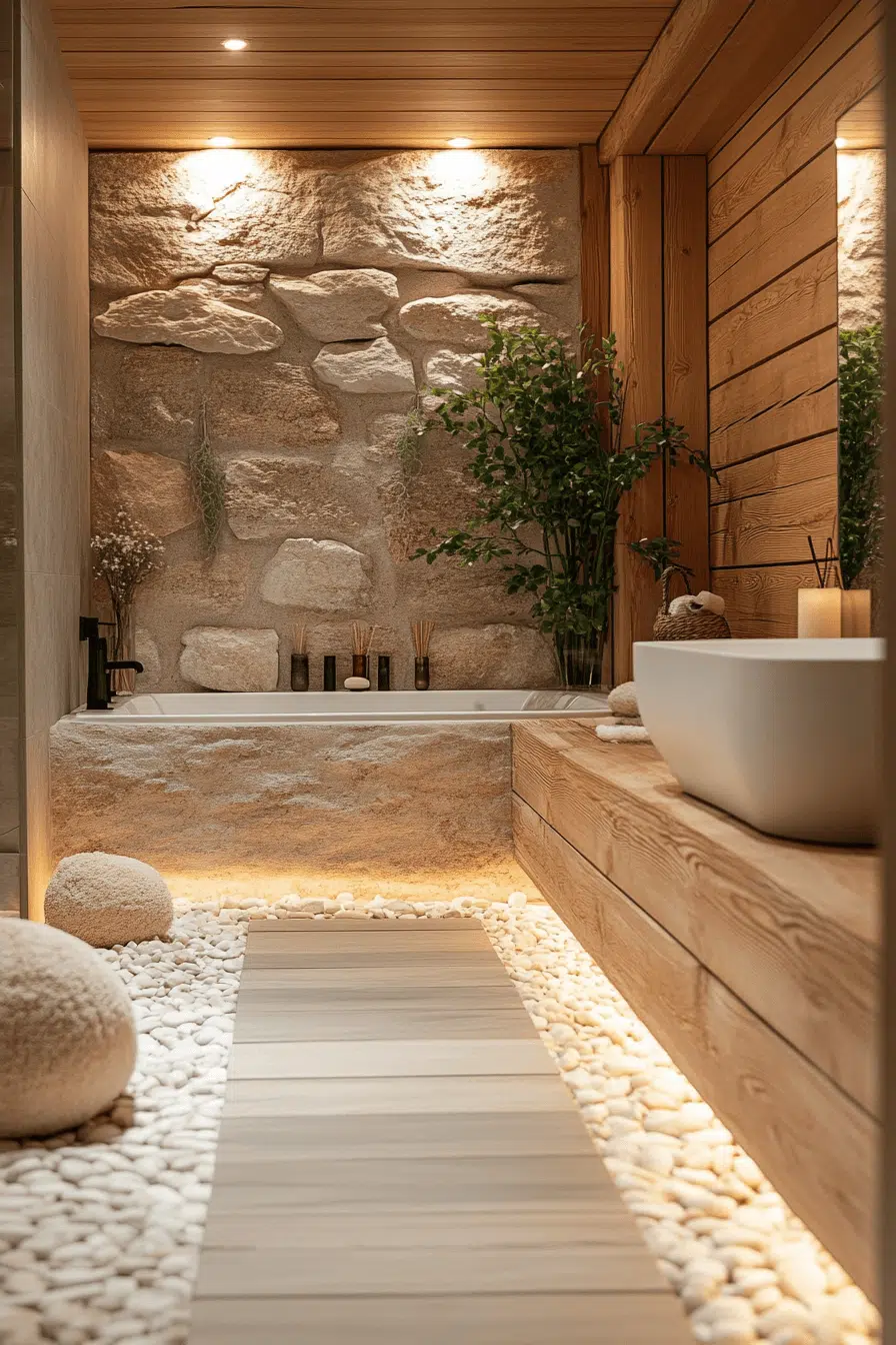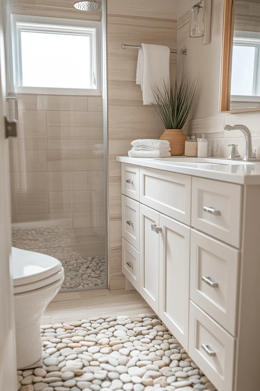Pebble-inspired textures introduce natural beauty into small guest bathroom ideas with a calming, spa-like feel. Whether used in flooring or accents, they add depth and visual interest. Soft tones and gentle lighting enhance the peaceful atmosphere. Clean fixtures keep the design balanced. The overall look feels grounded and refreshing. Bring nature-inspired calm into your space!