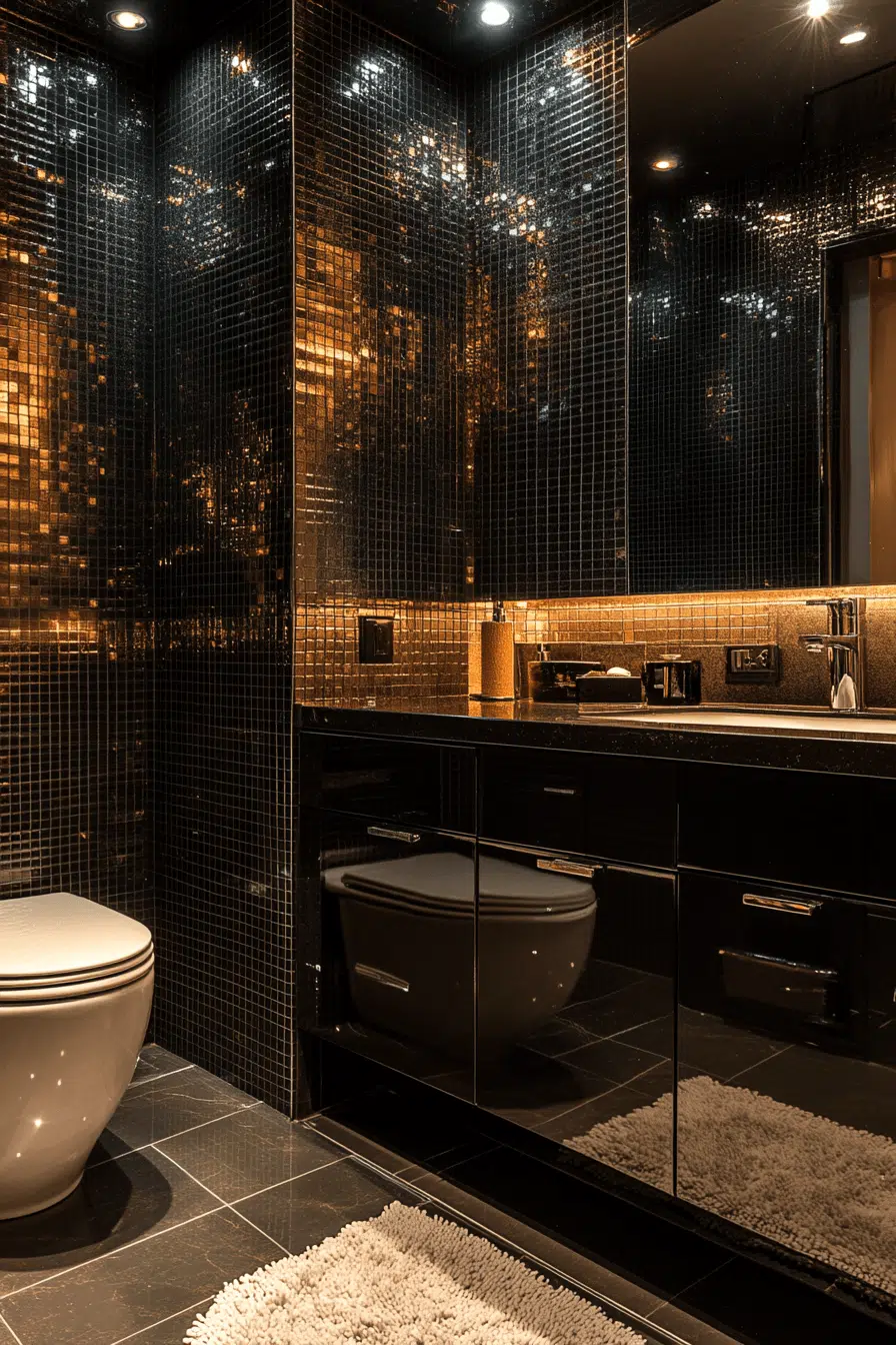 Glossy finishes create bold small guest bathroom ideas with a sleek, urban edge that feels modern and refined. Reflective surfaces brighten the room while making it feel more spacious. Dark accents add contrast and sophistication. Strategic lighting highlights the shine without making the space feel heavy. The overall look feels polished and confident. Add a modern edge to your bathroom design!
