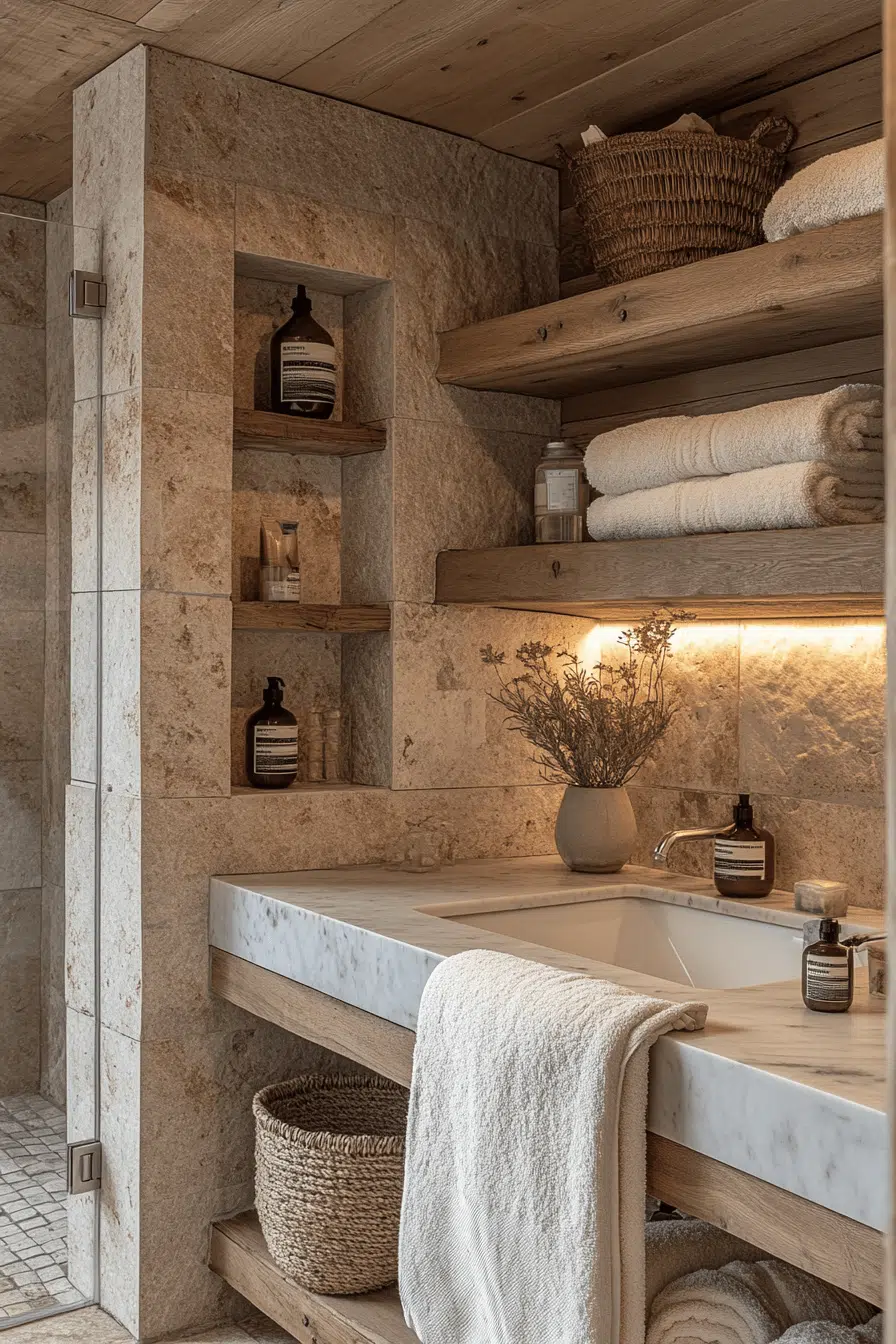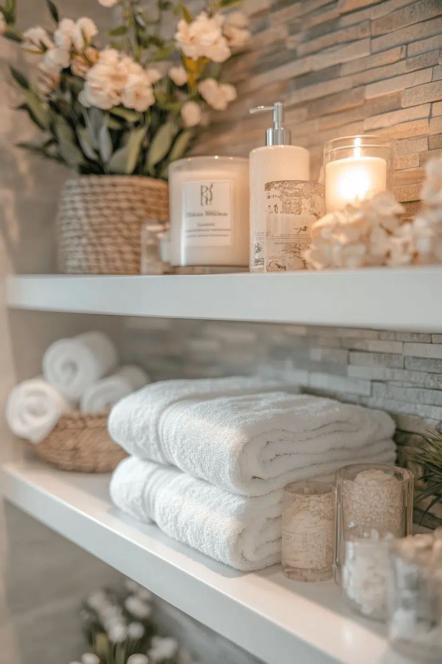 Open shelving transforms small guest bathroom ideas into functional yet stylish spaces. Floating shelves provide storage without crowding the room. Neatly arranged items add personality. The layout remains airy and easy to navigate. It’s a practical solution that still feels polished. Upgrade your storage with open shelving!
