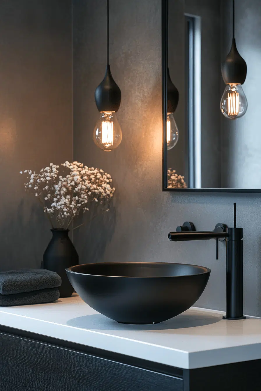 A bold monochrome palette defines small guest bathroom ideas with striking contrast and timeless appeal. Black and white tones create strong visual interest while maintaining a clean look. Simple lines keep the design uncluttered. Lighting softens the contrast for balance. Subtle textures add depth without distraction. The space feels modern and refined. Try a monochrome look for bold style!