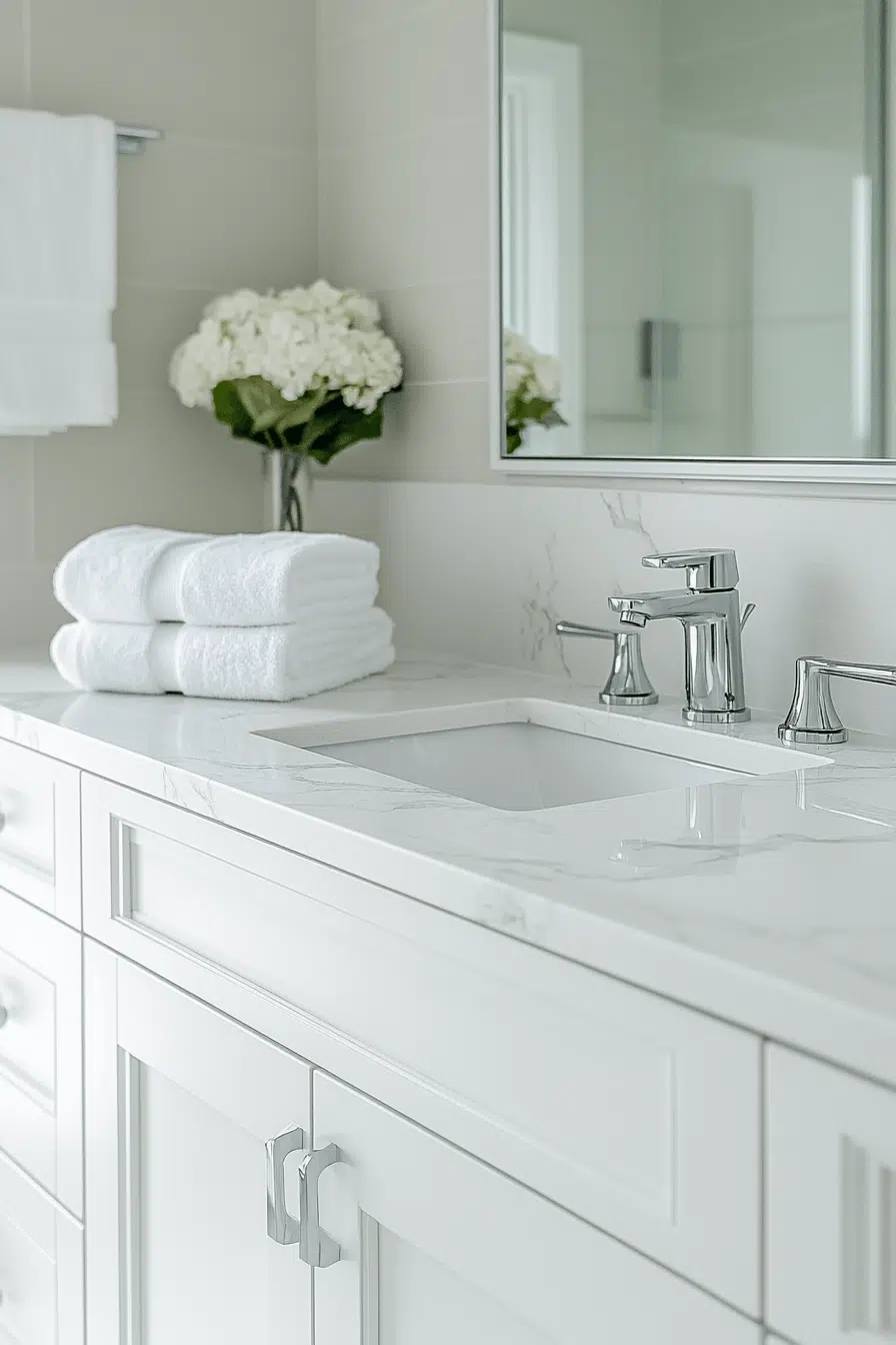 Quartz surfaces bring durability and beauty into small guest bathroom ideas with a clean, polished finish. Light tones keep the space bright and open. Subtle patterning adds depth without overwhelming the design. Minimal styling highlights the material’s quality. The overall look feels modern and practical. Perfect for everyday use. Upgrade your bathroom with quartz!