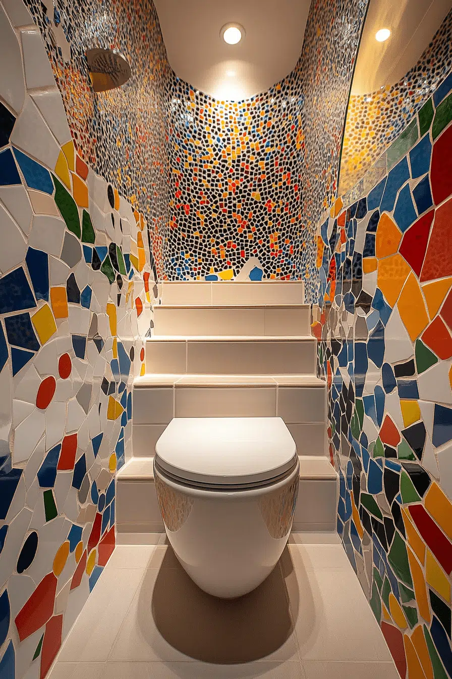 Mosaic tile details energize small guest bathroom ideas with texture, movement, and personality. Small patterns work beautifully in compact spaces. Bright lighting enhances the intricate design. Balanced styling keeps everything cohesive. The room feels lively and unique. Add a creative touch with mosaic accents!
