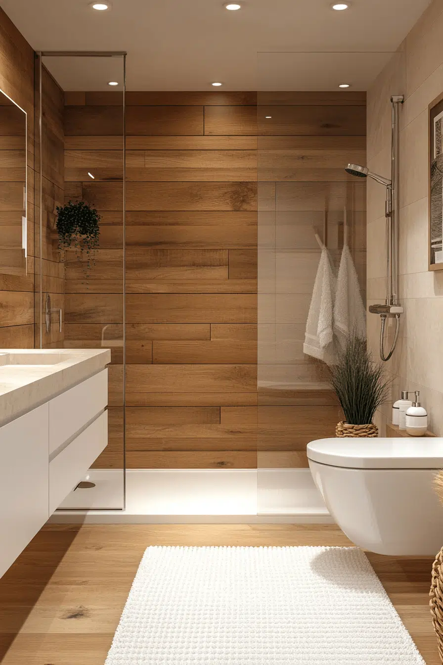 Natural wood accents warm up small guest bathroom ideas with a grounded, inviting feel. Soft grain patterns add texture without heaviness. Paired with light tones, the design remains airy and bright. Clean fixtures balance the organic elements. The result feels modern and comfortable. Bring warmth into your bathroom with wood details!