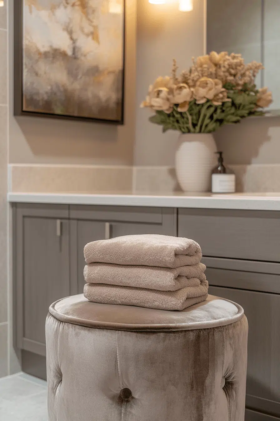 Velvet-inspired accents introduce subtle luxury into small guest bathroom ideas with soft texture and contrast. Paired with sleek finishes, the design feels balanced and refined. Lighting enhances the richness of the materials. The space feels cozy yet elevated. Small details create a big impact. Add a touch of softness for a luxe feel!
