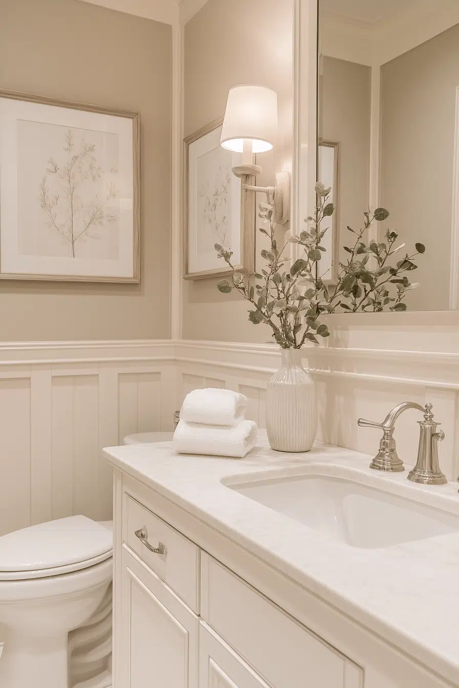 Paneled walls add structure and charm to small guest bathroom ideas with a timeless, tailored look. Subtle tones keep the design light and welcoming. The texture creates depth without clutter. Paired with simple fixtures, the space feels polished and refined. Warm accents enhance the cozy feel. Add classic detail for an elevated finish!